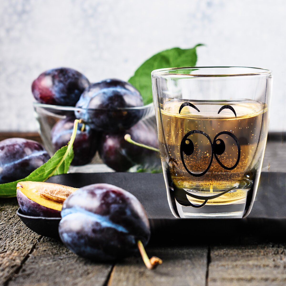 Vysmátá sada šesti skleněných odlivek, do kterých se vejde jeden „malý panák“ vašeho oblíbeného tvrdého alkoholu.