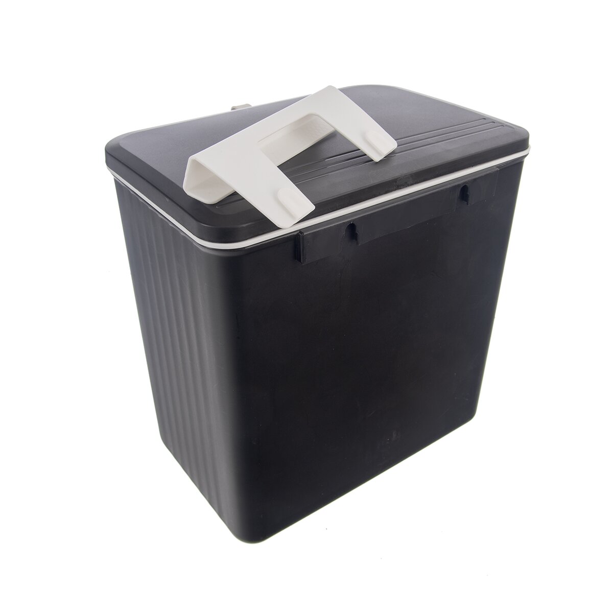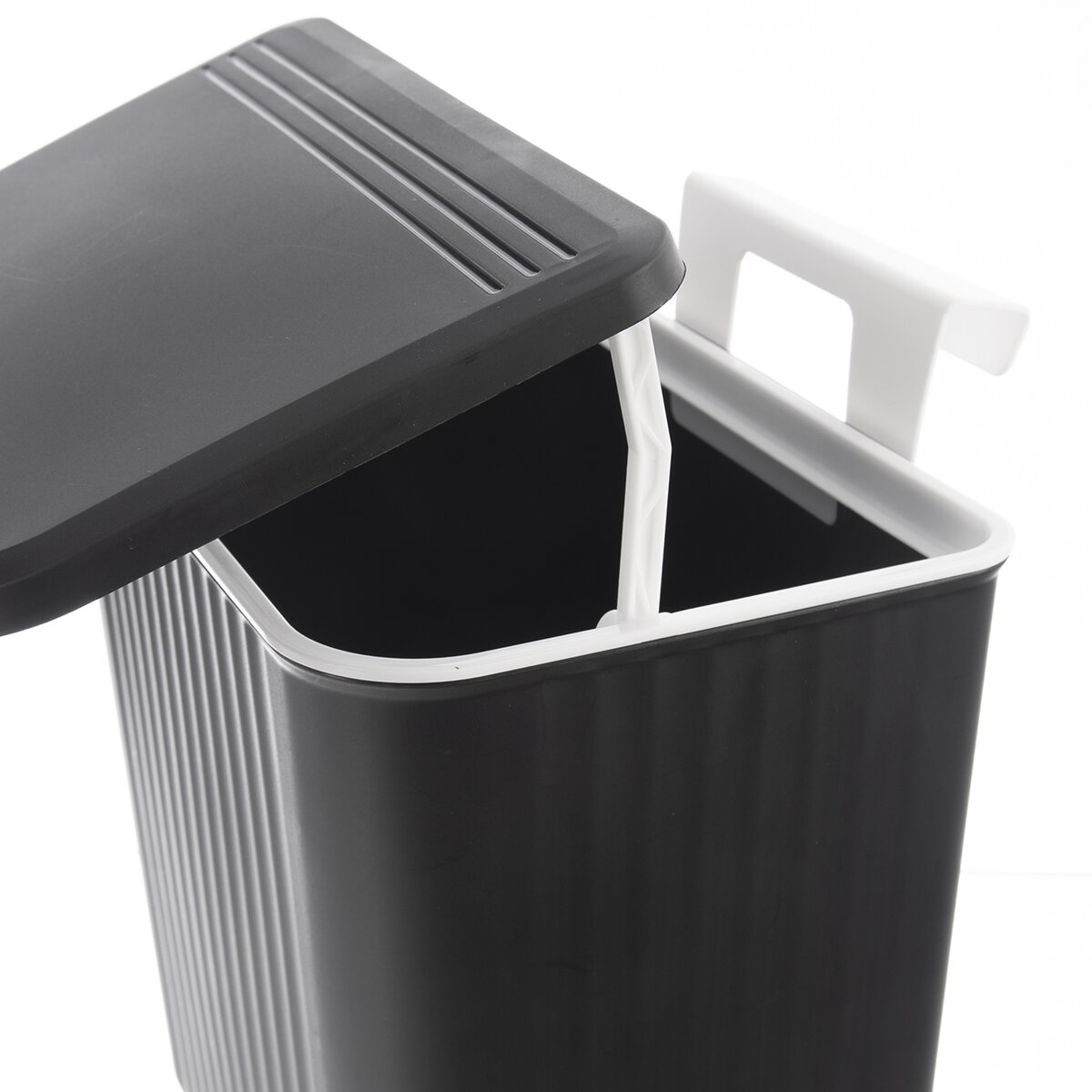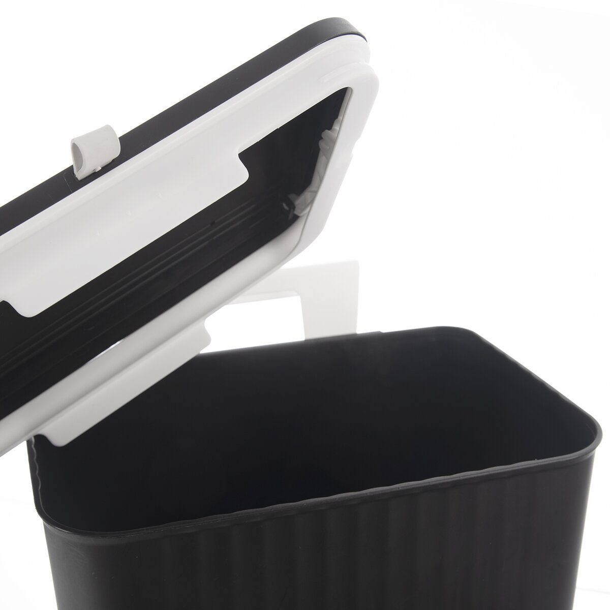Kód produktu 731721Černý odpadkový koš s bílým lemem má objem 13 l a lze jej umístit na zem, za držák na dvířka skříňky nebo jej upevnit pomocí šroubů za zeď. Víko lze klasicky vyklopit nebo přesunout díky šikovnému mechanismu do přední části, což usnadní likvidaci odpadků.