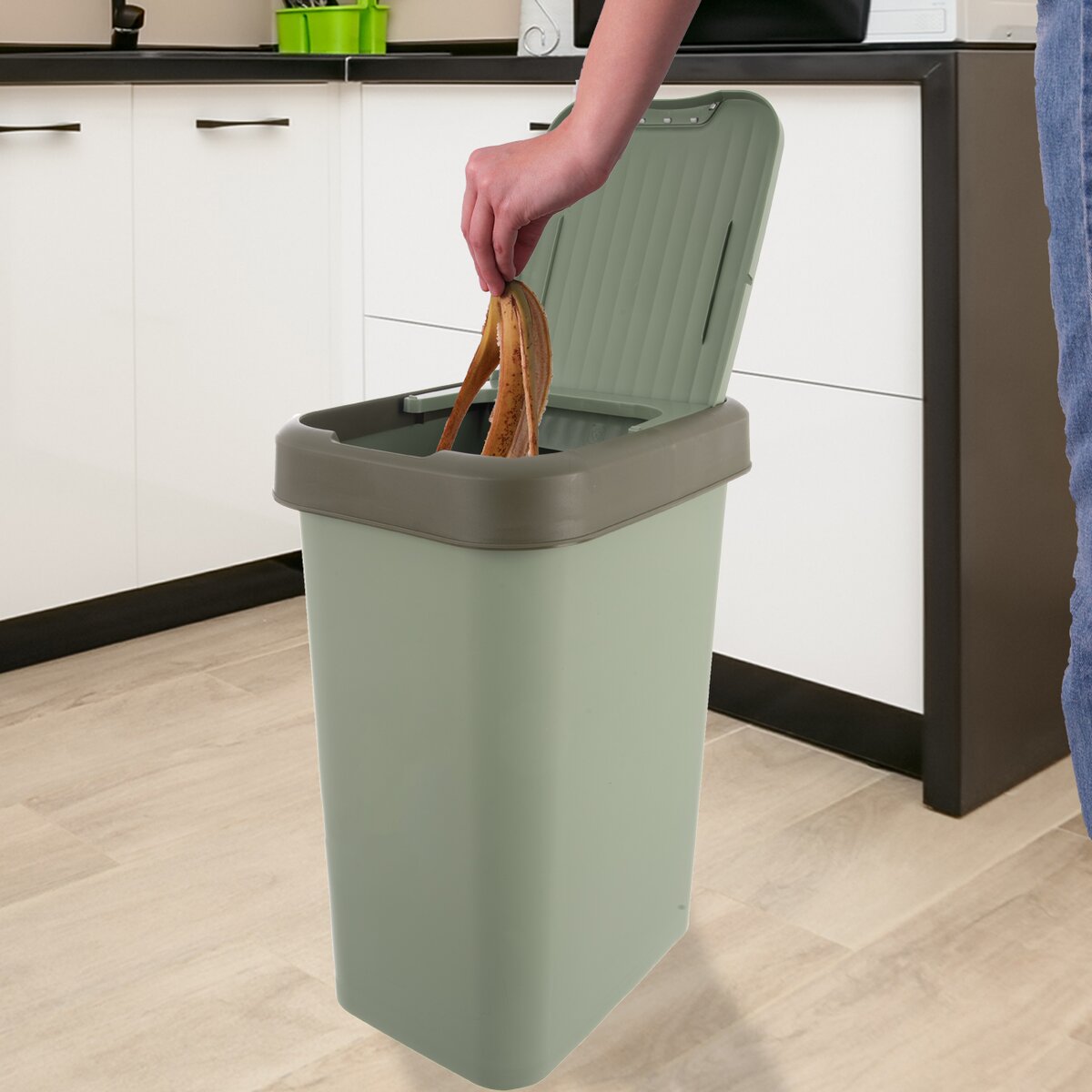 Kód produktu 731737Zelený odpadkový koš o objemu 25 l má výklopné víko, které lze otvírat třemi způsoby.