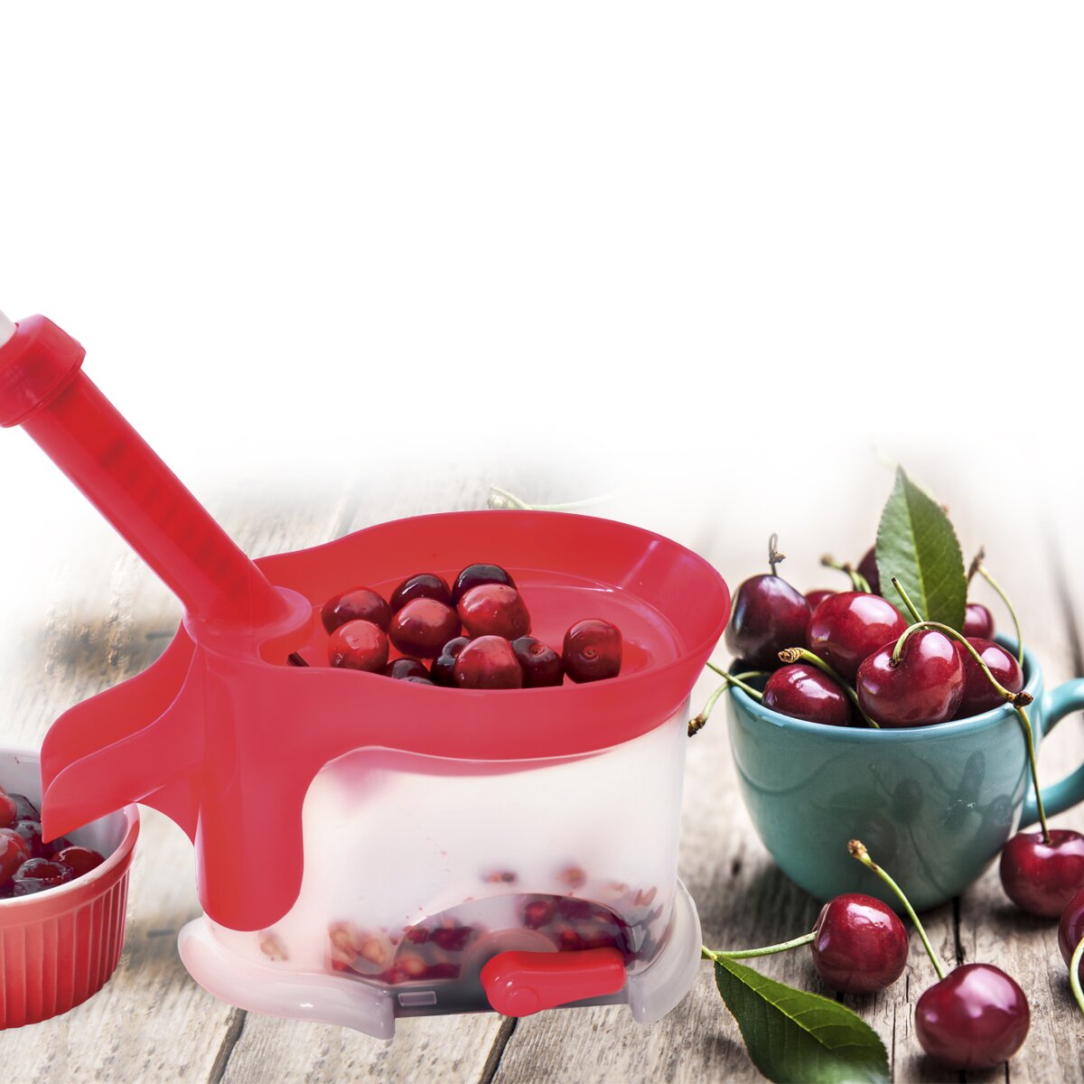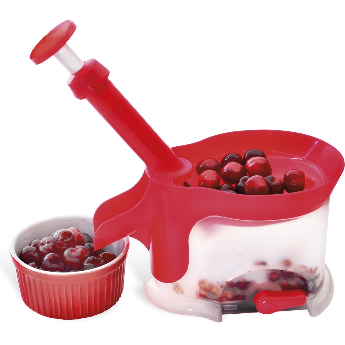 Odpeckovač třešní a višní je snadno vypeckuje. Ovoce stačí postupně vsypat do velké horní násypky, pomocí pružinového systému v rukojeti je pecka protlačena do zásobníku. Odpeckované ovoce pak vypadne mimo strojek do jakékoliv připravené nádoby. Vyroben z plastu PP.