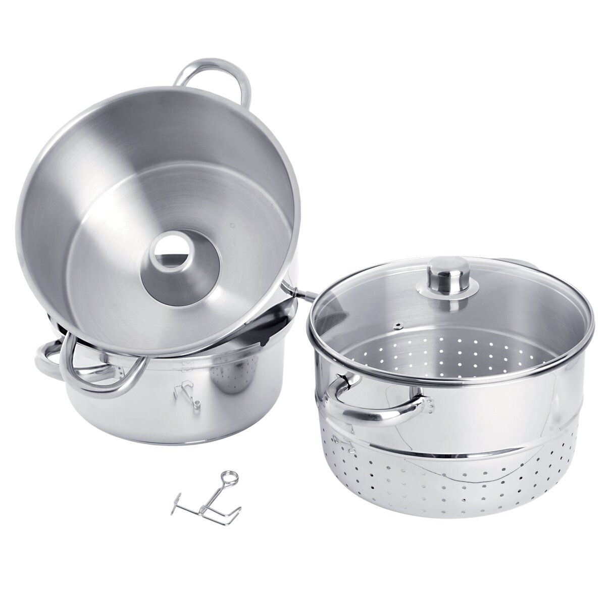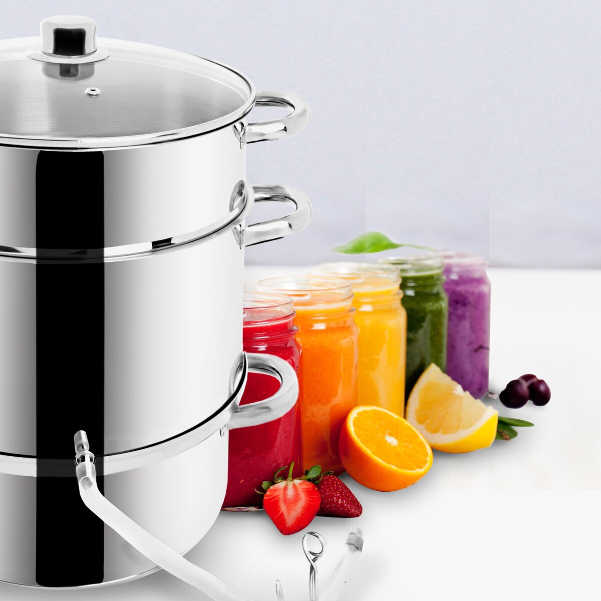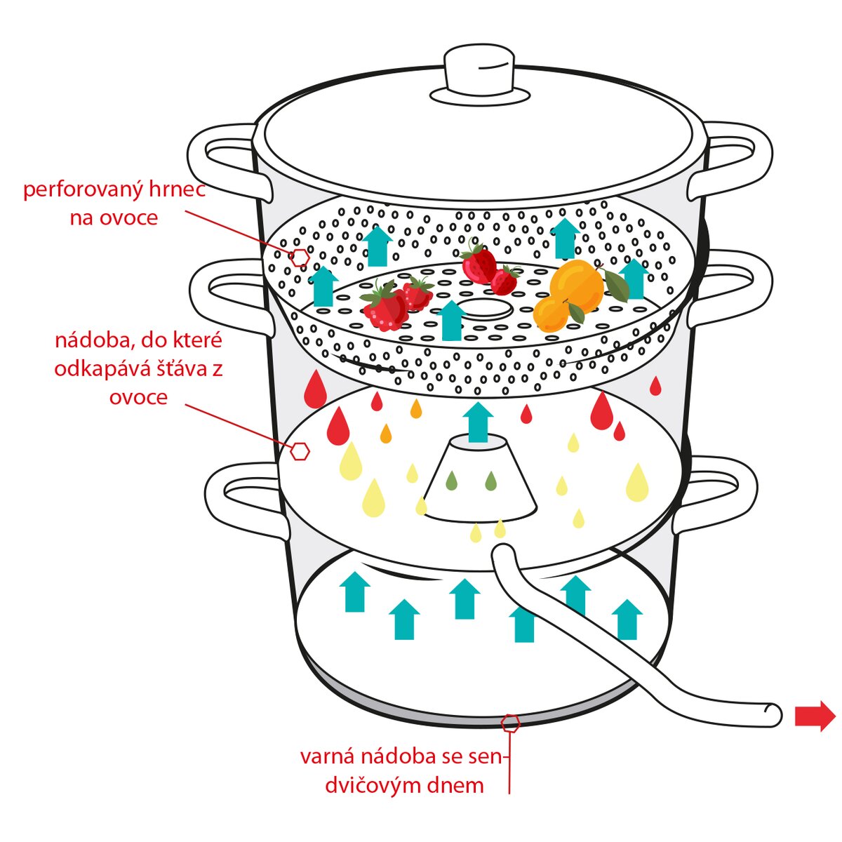 Spodní varná nádoba má sendvičové dno, které efektivně rozvádí teplo a je vhodná i na indukční vaření. Nalitá voda varem propařuje ovoce, které stačí umyté a přebrané vložit do horní nádoby s perforovaným dnem. Šťáva se uvolňuje do prostředního patra, odkud postupně odtéká vypouštěcí hadičkou. Tu lze přímo stáčet do lahví nebo většího hrnce a s cukrem nechat želírovat.