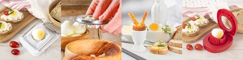 U nás najdete různé typy kráječů. Některé díky systému napnutých strun vytvoří z vajíčka vařeného natvrdo plátky na chlebíčky či do aspiku. Máme ale i kráječ, který vytvoří jediným stlačením šestinky.