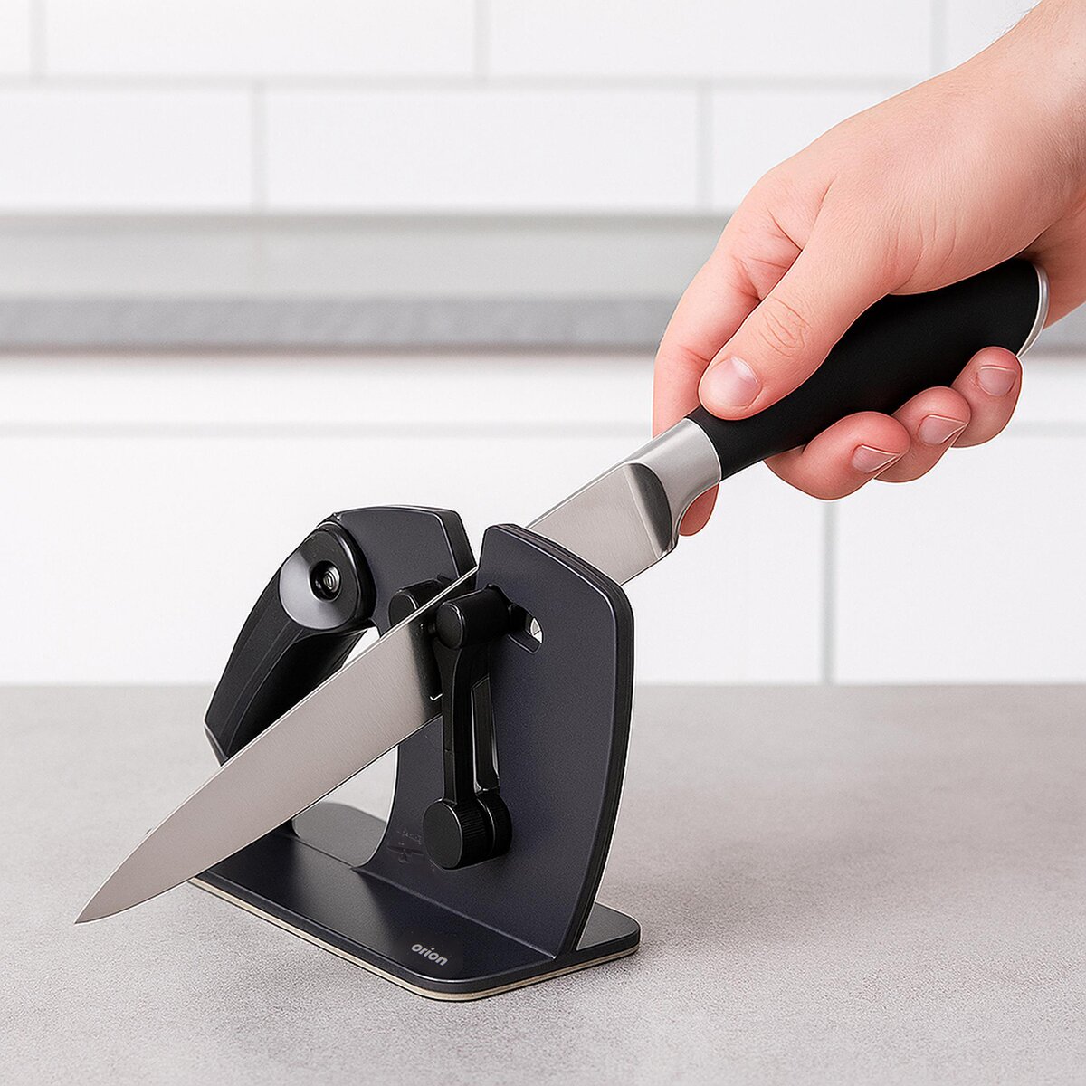 Nabízí 2 funkce: hrubé ostření pro obnovení ostrosti nože, kdy špička čepele směřuje dolů, a jemné dobroušení pro hladší čepel, kdy špička čepele směřuje nahoru.