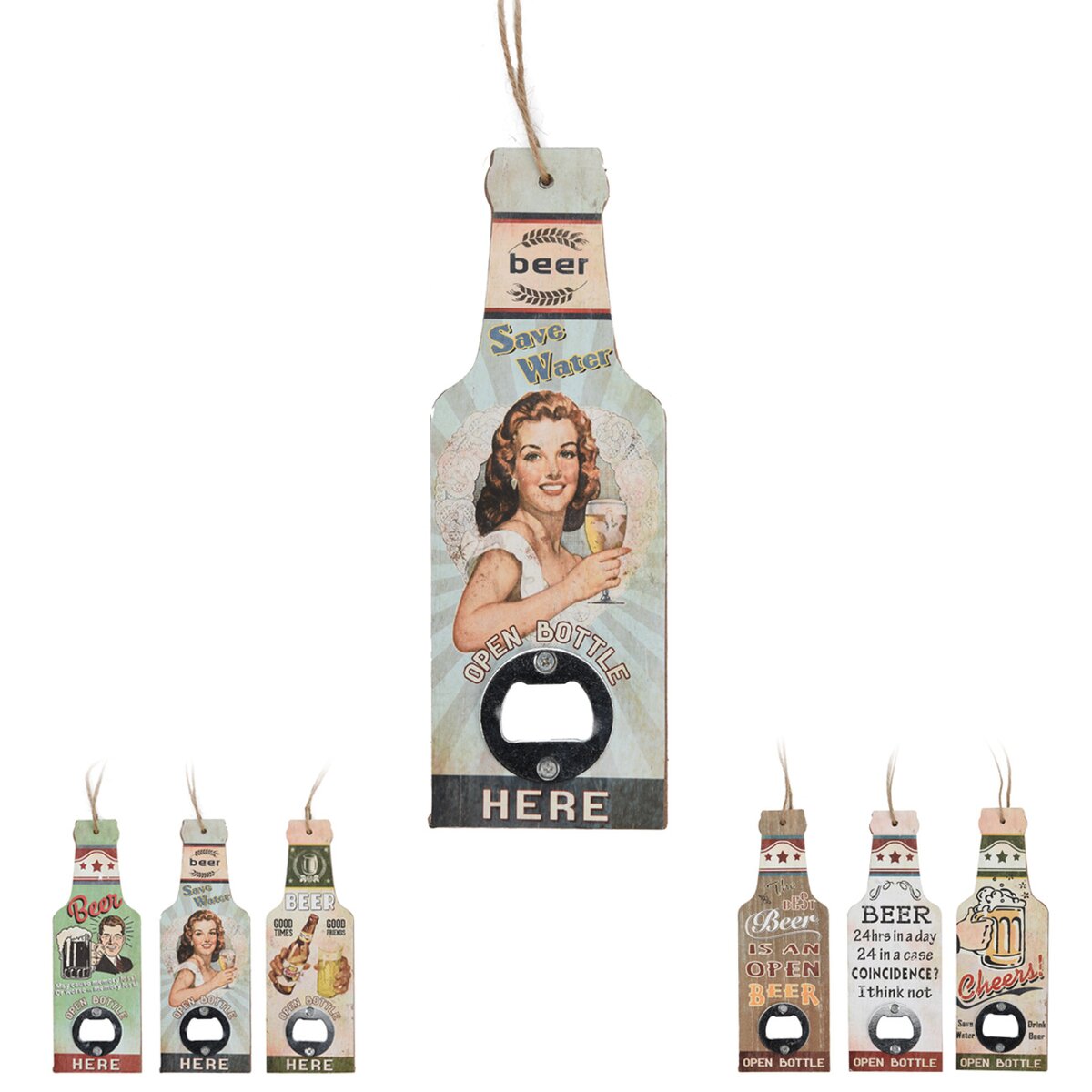 Otvírák na korunkové uzávěry v retro stylu. Možnost zavěšení. Assort dekorů. Materiál: dřevo (překližka), kov. Rozměry: 20x7x1 cm.
