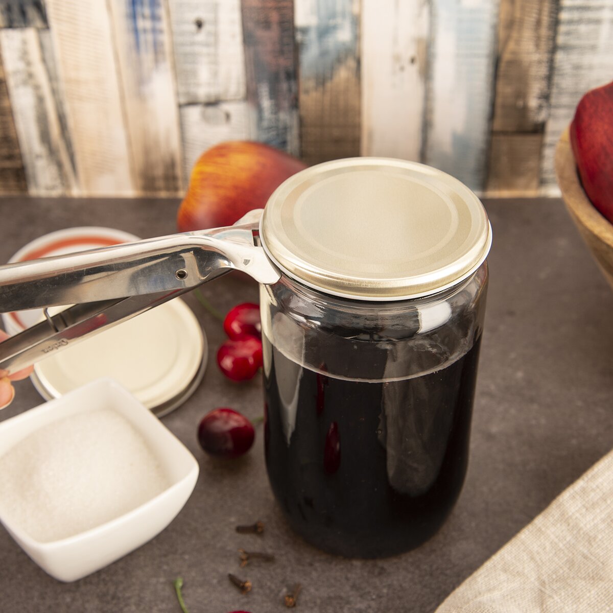 Kleště stačí vsunout pod víčko, mírně zaklonit dolů a lehce stisknout. Tento pohyb způsobí uvolnění víčka, díky čemuž ho můžete bez poškození sundat ze sklenice a při dalším zavařování znovu použít.