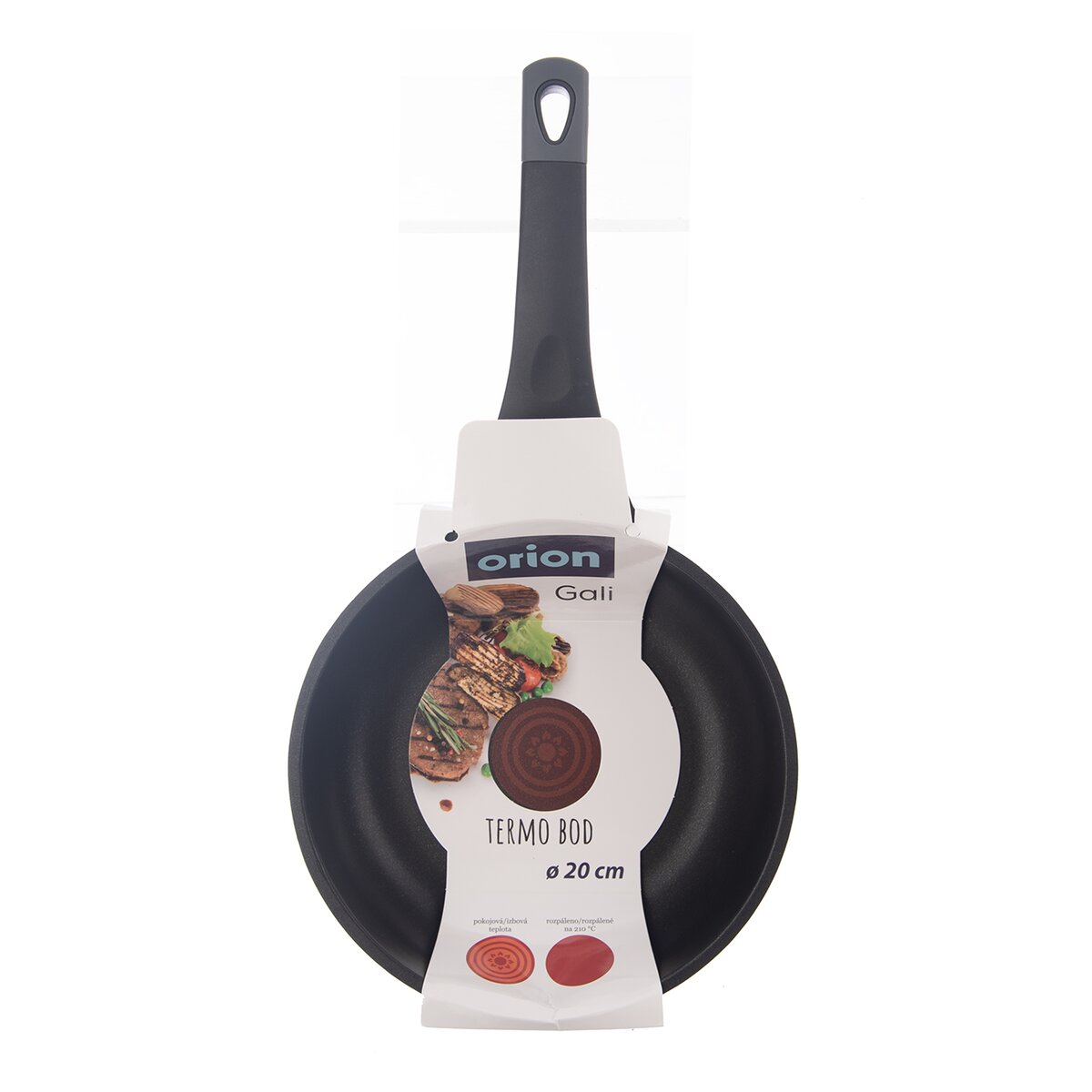- pánev lze zavěsit za otvor na konci rukojeti, potažené silikonem v příjemném šedém odstínu