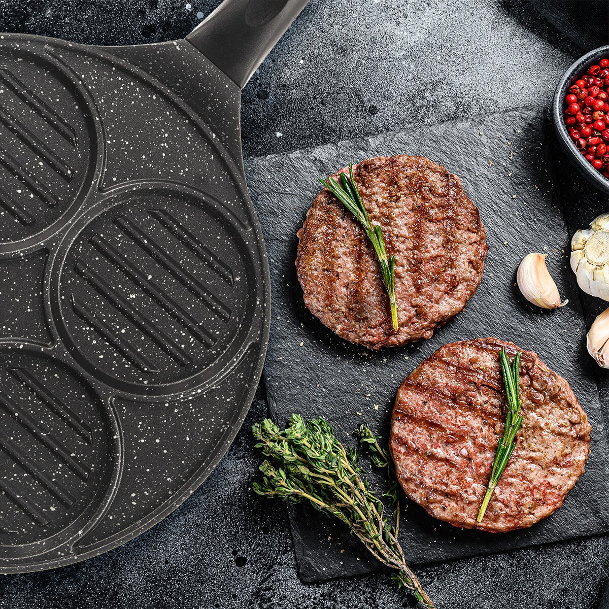 Kód produktu 113201Nepřilnavá pánev GRANDE průměru 26,5 cm, se čtyřmi sekcemi, na přípravu šťavnatých hamburgerů i masových nebo zeleninových karbanátků. Vhodná na všechny typy spotřebičů včetně indukce.