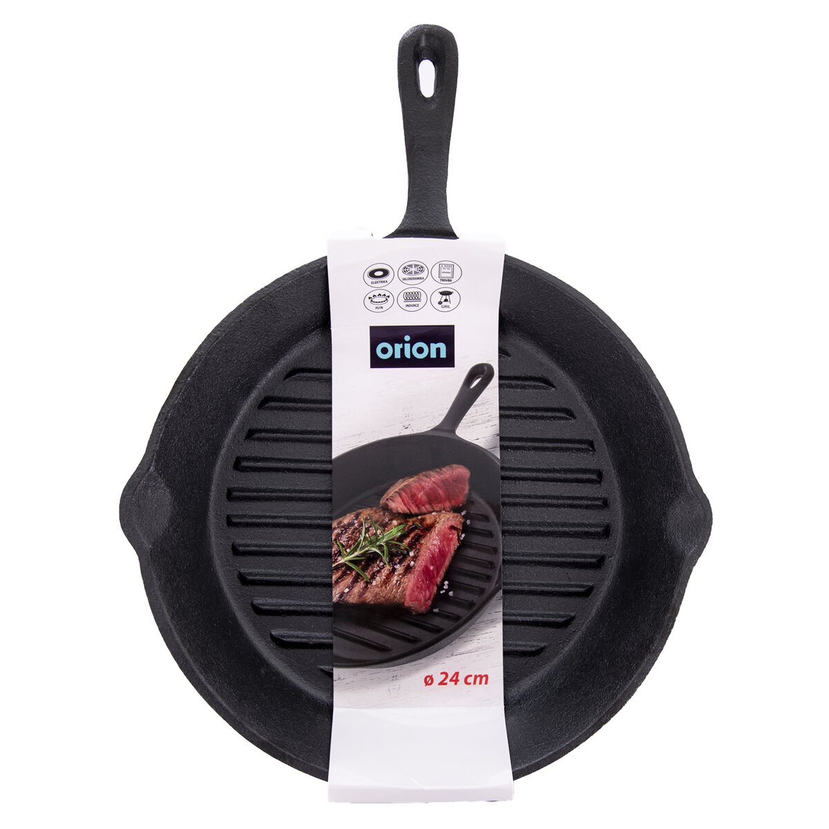 Kód produktu 112987Masivní litinová grilovací pánev průměru 24 cm, s typickou žebrovanou strukturou, pro intenzivní i pozvolné opékání steaků, zeleniny a dalších oblíbených pokrmů na všech typech sporáků, v troubě i na grilu.