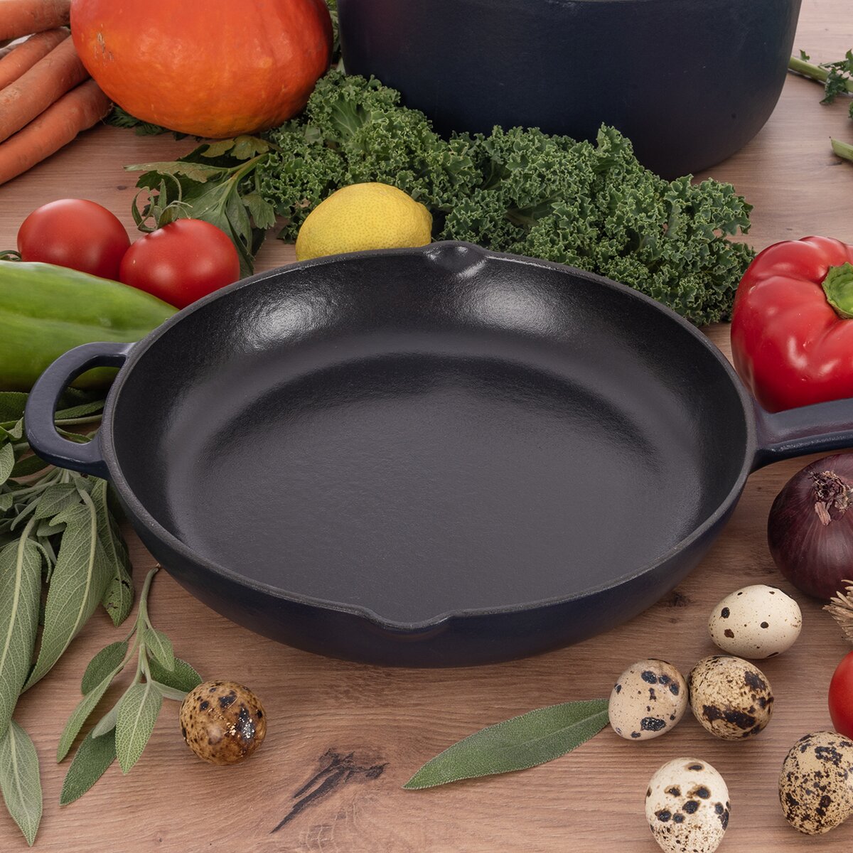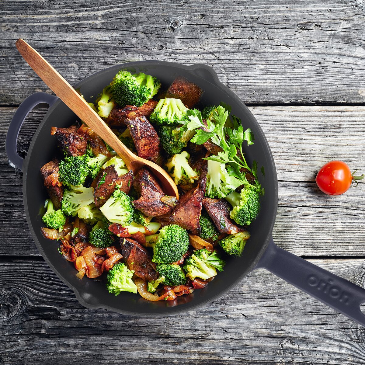 - pánve výšky 4,8 cm a v držadle 6 cm jsou skvělé pro pomalé pečení při nižší teplotě, ale můžete je, jako každou litinovou nádobu, rozpálit na vysokou teplotu, např. při prudkém opékaní masa, aby se zatáhlo (až při 250 °C)
