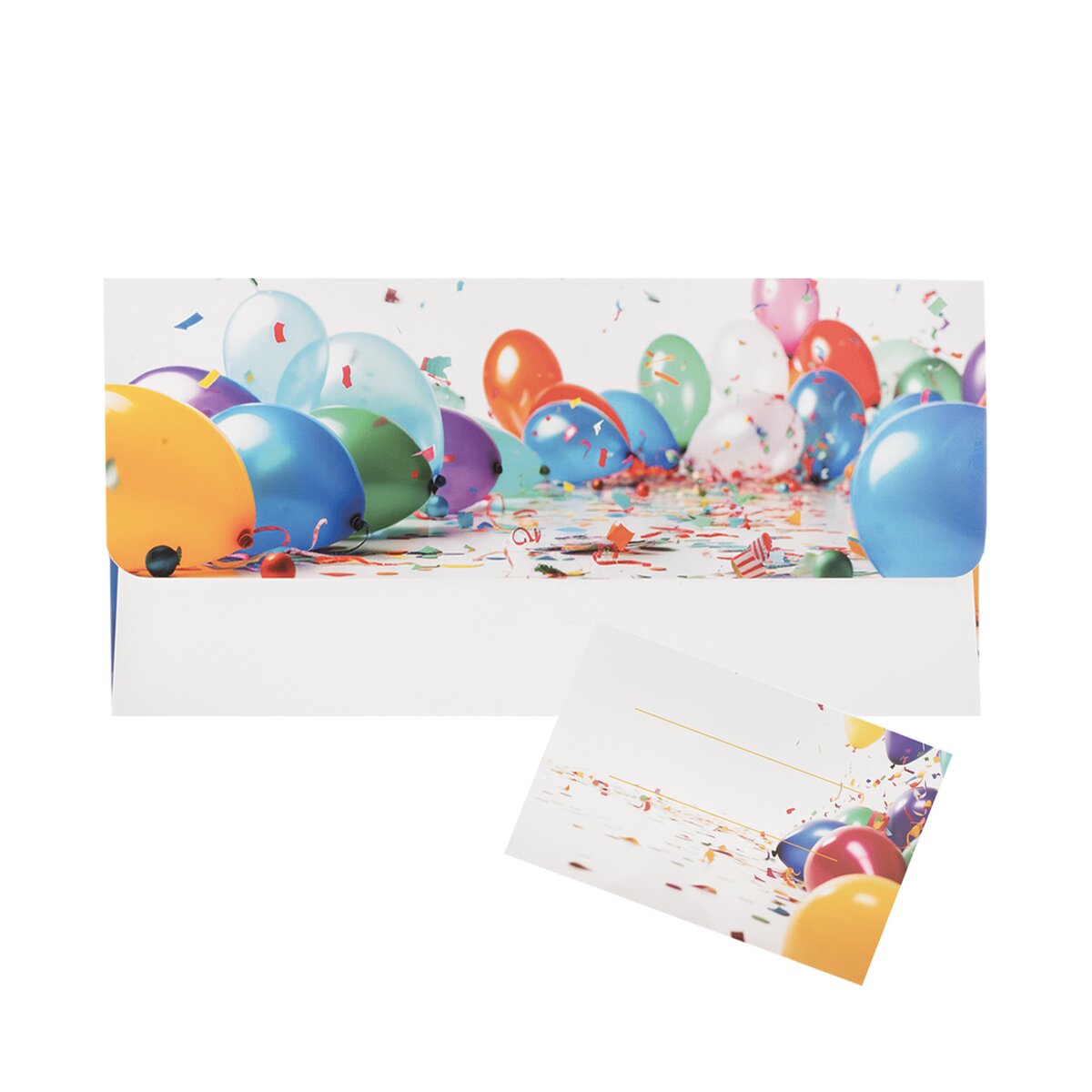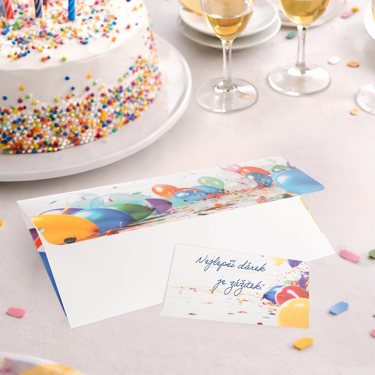 Kód produktu 842382Papírová obálka s vloženou kartou, kam lze napsat poděkování či vzkaz obdarovanému, je určena k decentnímu předání hotovosti, voucheru a různých poukazů. Zdobí ji pestré nafukovací balónky a konfety.