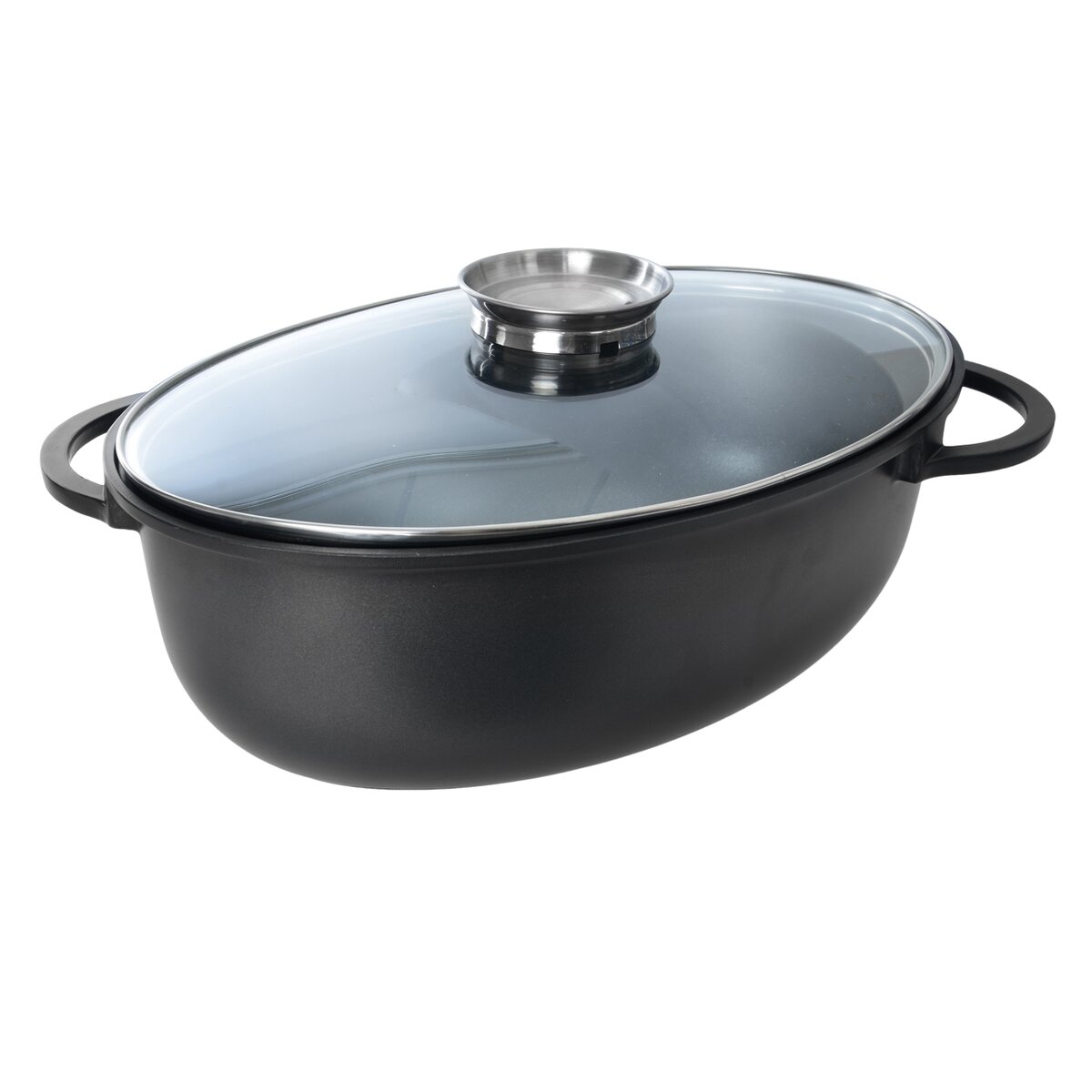Kód produktu 123766Masivní pekáč s nepřilnavou povrchovou úpravou a se skleněným víkem s aroma úchytem, který umožní dochucování pokrmu během pečení.