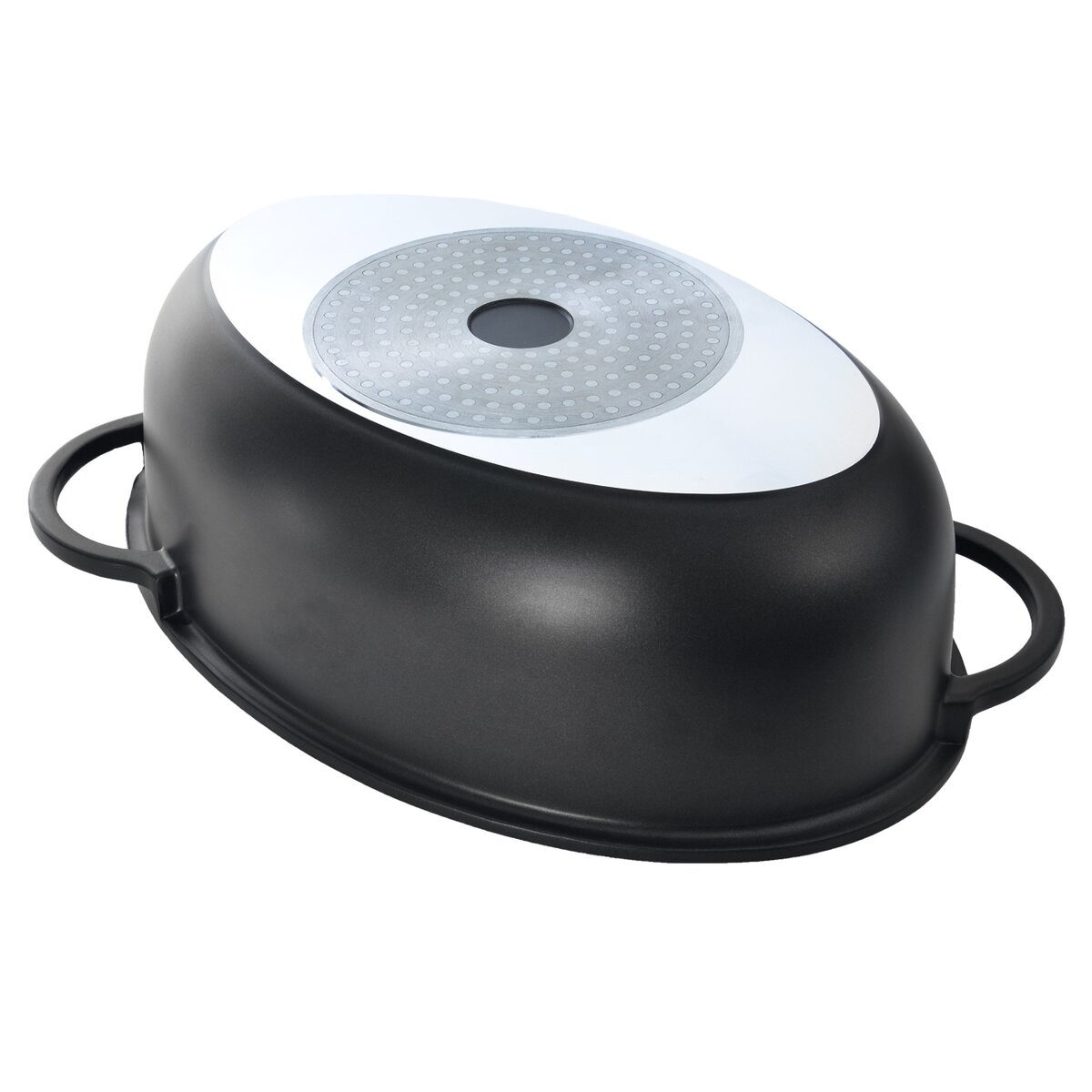 Perfektní kombinaci pečení s minimálním množstvím tuku v troubě a vaření v páře na všech typech sporáků včetně indukce, nabízí tento masivní, a přesto lehký pekáč. Pekáč o rozměru 43x30x13,5 cm se pohodlně vejde do běžné kuchyňské trouby.