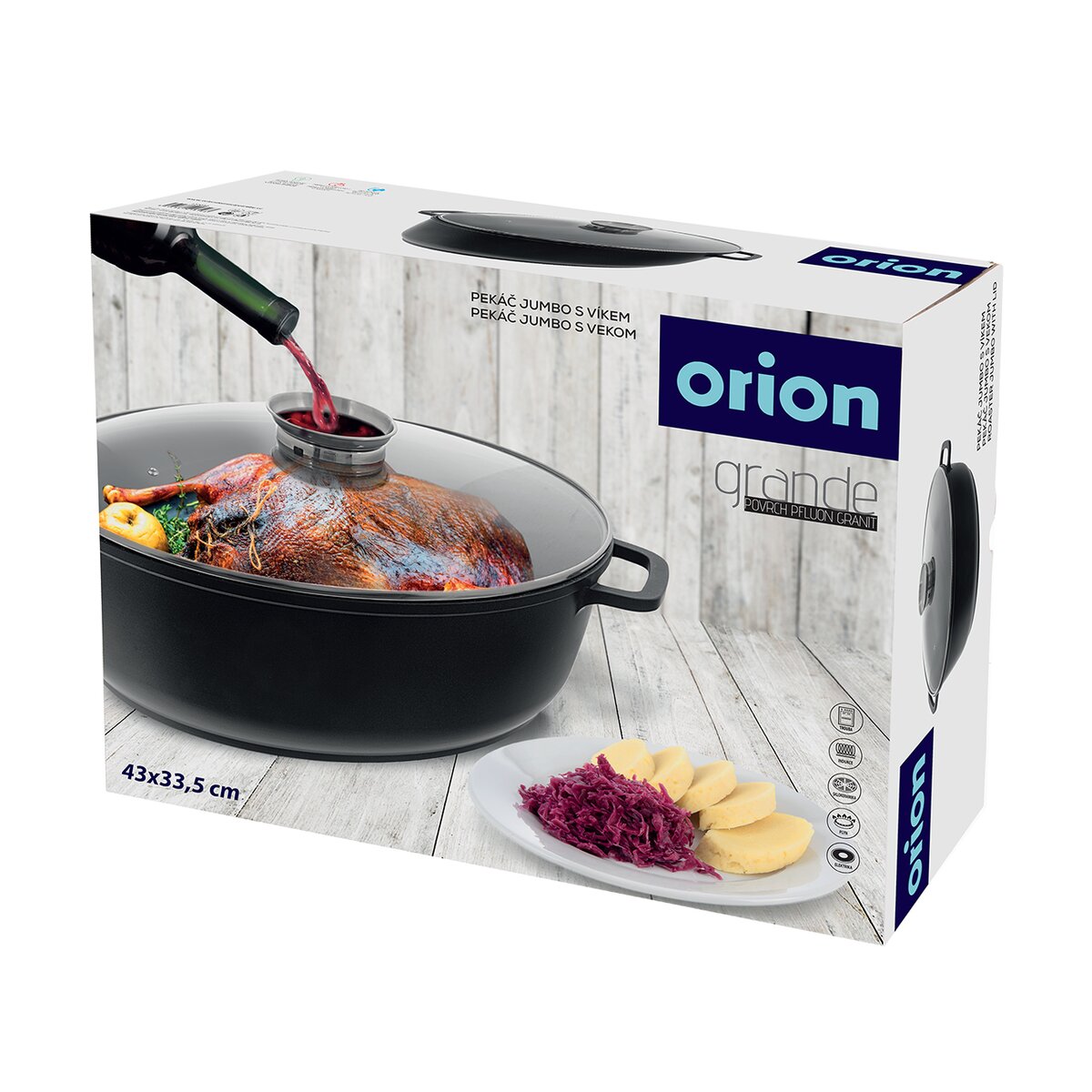 Více informacíKombinaci pečení s minimálním množstvím tuku v troubě a aromatizované vaření na všech typech sporáků včetně indukce, nabízí pekáč GRANDE. Díky rozměru 43x33,5x14 cm (celková výška i s poklicí je 20 cm) a mimostředně umístěným úchytům se pohodlně vejde do běžné kuchyňské trouby. Svou velikostí se hodí na pečení husy, krůty, vepřové pečeně, voňavého kolínka i k vaření velkých šišek houskových knedlíků.