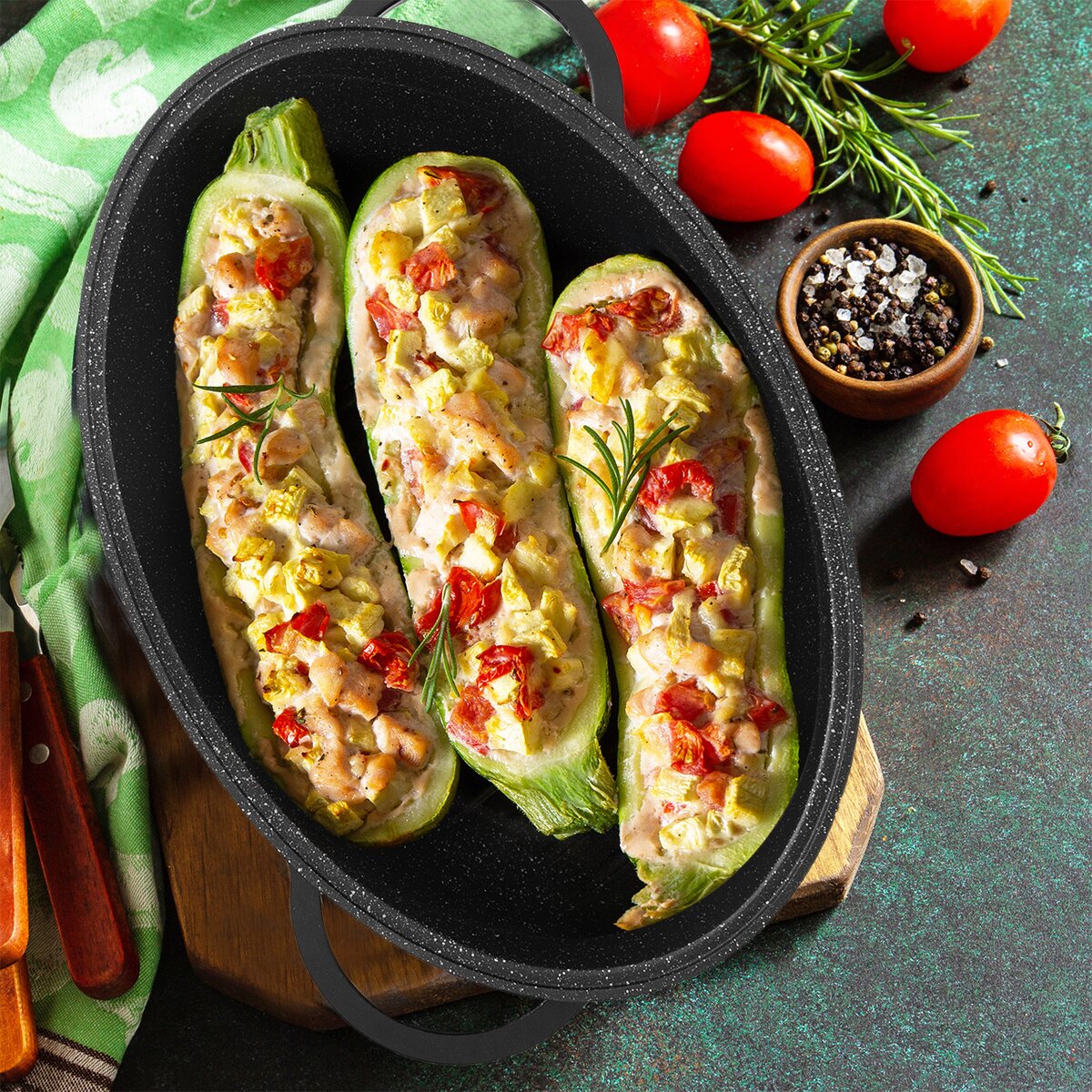 - hliníkové tělo pekáče je výborným vodičem tepla, proto lze troubu vypnout s předstihem a nechat pokrm "dojít"