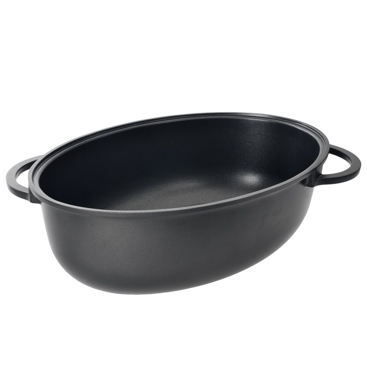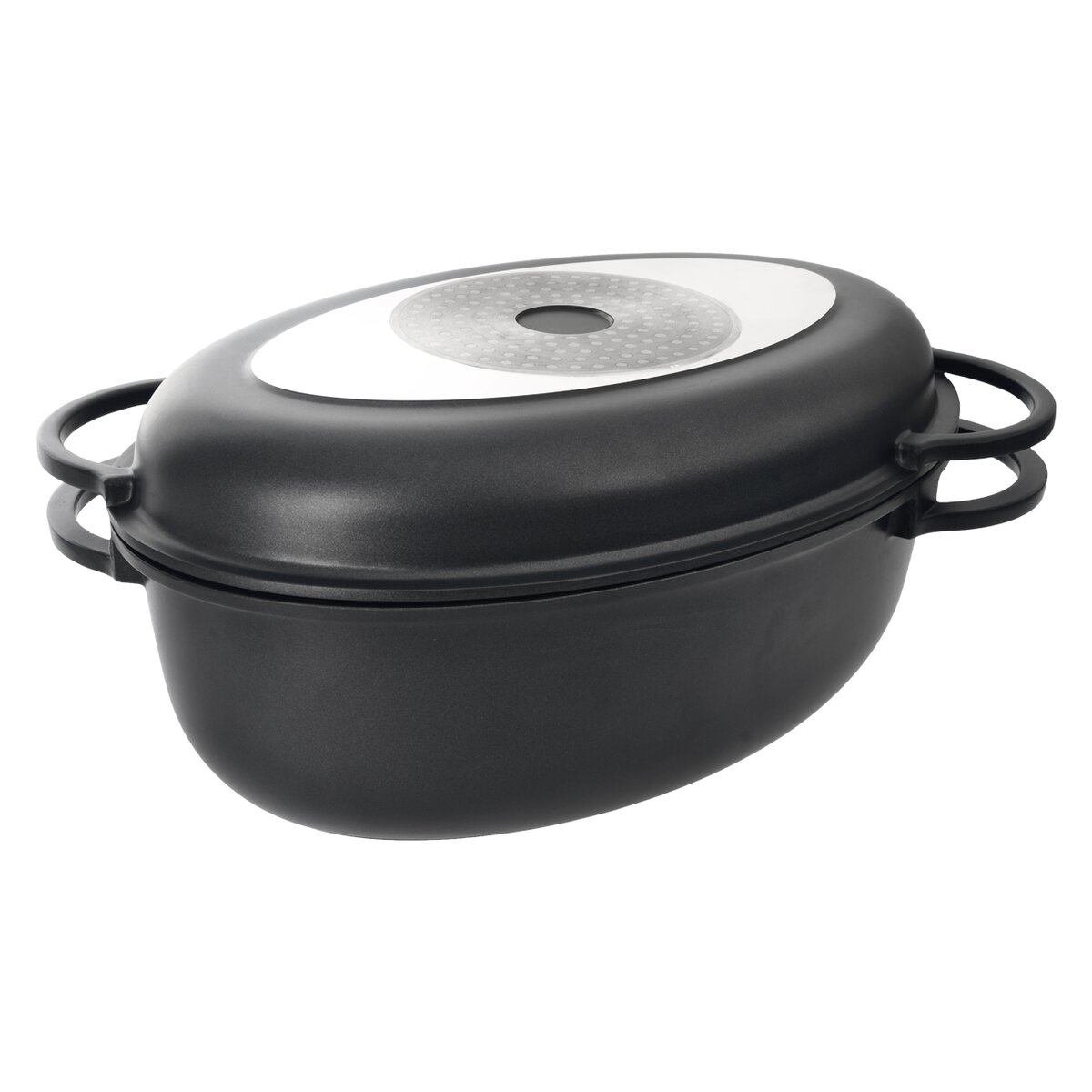 - hlavní hliníková nádoba i nízký poklop mají kvůli snadnější manipulaci pevná, mimostředně umístěná držadla, aby nezabírala v troubě tolik prostoru