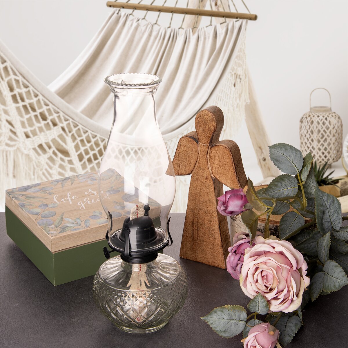 Kód produktu 822259Petrolejová lampa se skleněným tělem, klasickým cylindrem s dekorativní horní částí a bavlněným knotem slouží po naplnění petrolejem nebo lampovým olejem jako doplňkové světlo v interiéru.