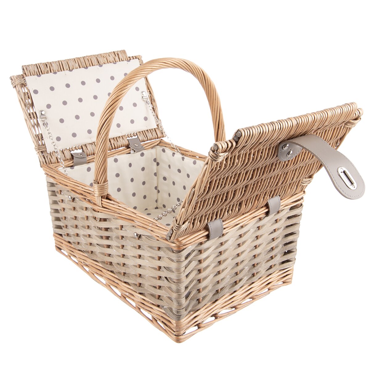 Kód produktu 730566Hranatý proutěný koš se dvěma víky a pevným držadlem má uvnitř látku a je ideální na piknik.