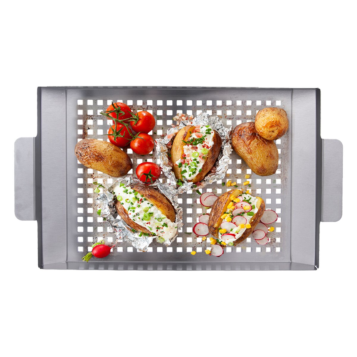 Plech grilovací skvěle využijete k přípravě masa, ryb, špízů a dalších pochutin na grilu nebo v troubě. Maso nebo špízy či ryby položíte na plech a umístíte jej na gril nebo do trouby, můžete použít i na přímý plamen. Pohodlně můžete obsah během přípravy otáčet nebo odstavit, pokud by se vám pokrm připravoval rychleji než zbytek jídla a později dát zpět na žár grilu nebo do trouby. Plech je opatřen otvory, přes které proniká žár. Díky dvěma úchytům se snadno přenáší – nutnost použití kuchyňských chňapek. Materiál: nerez. Snadná údržba – je vhodný do myčky na nádobí. Rozměry: 38,5/33,5x22,5x3/4 cm.
