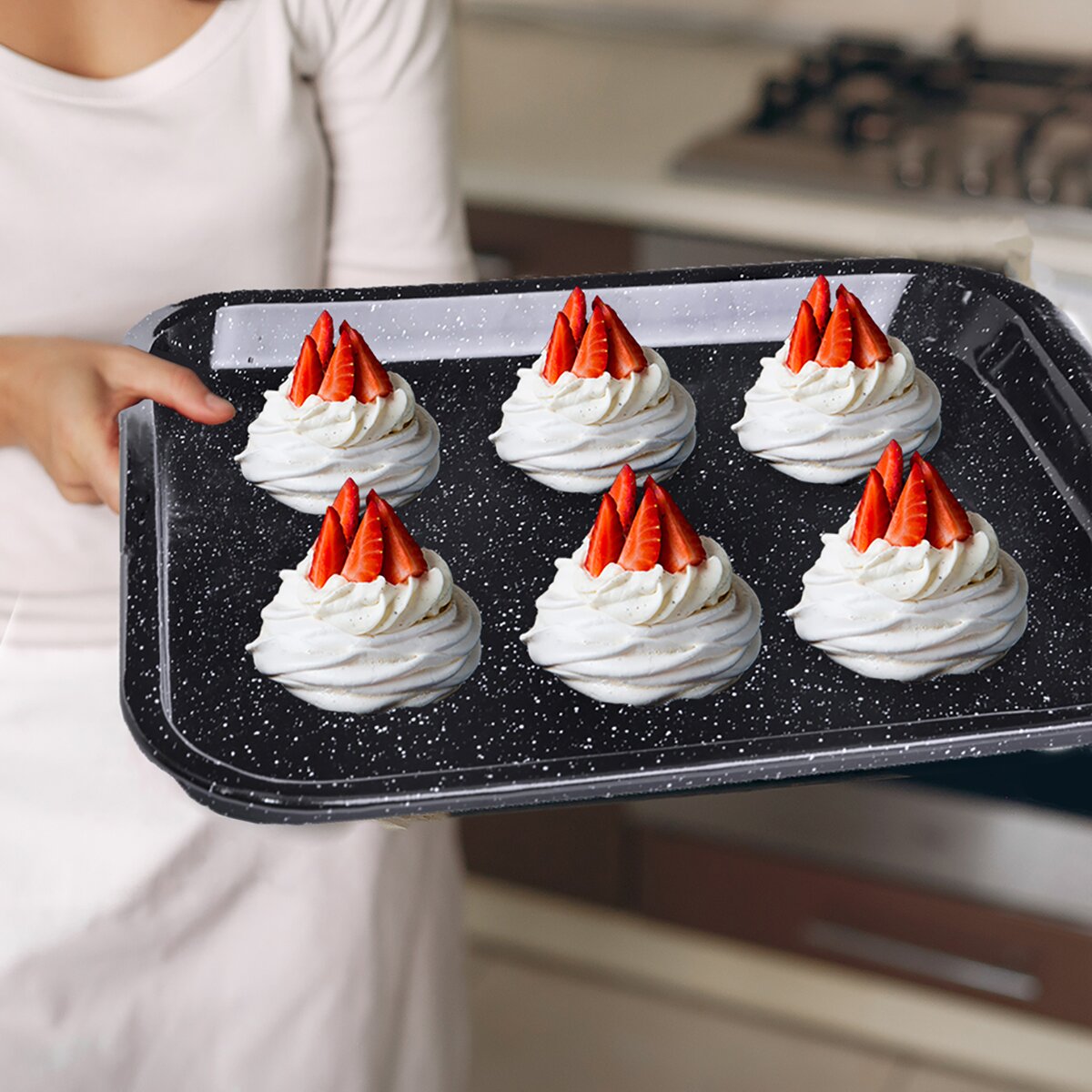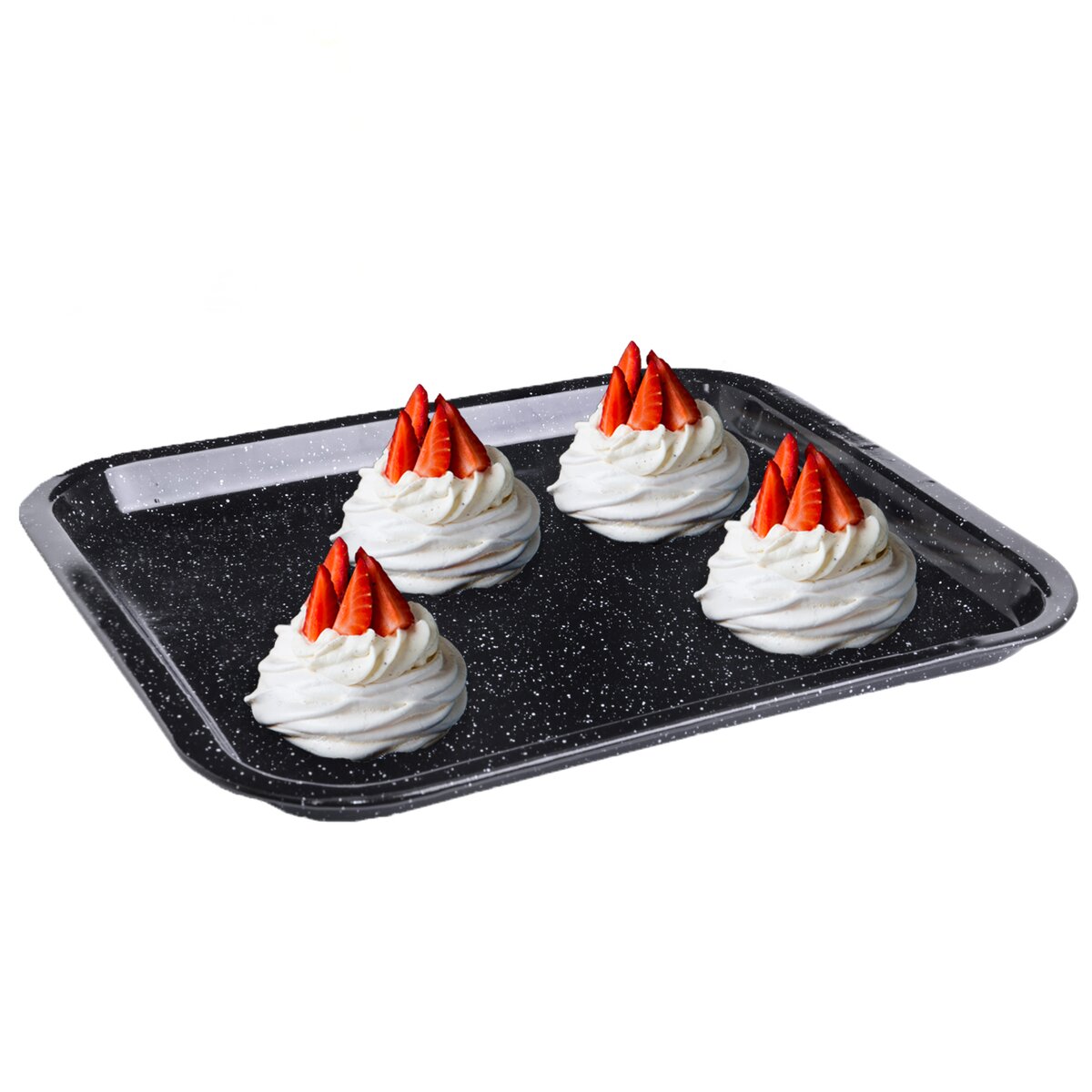 Kód produktu 123746Nízký smaltovaný plech velikosti 42x37 cm do trouby k pečení sladkých a slaných pokrmů, zapékání, gratinování nebo sušení, možnost umývat v myčce nádobí.