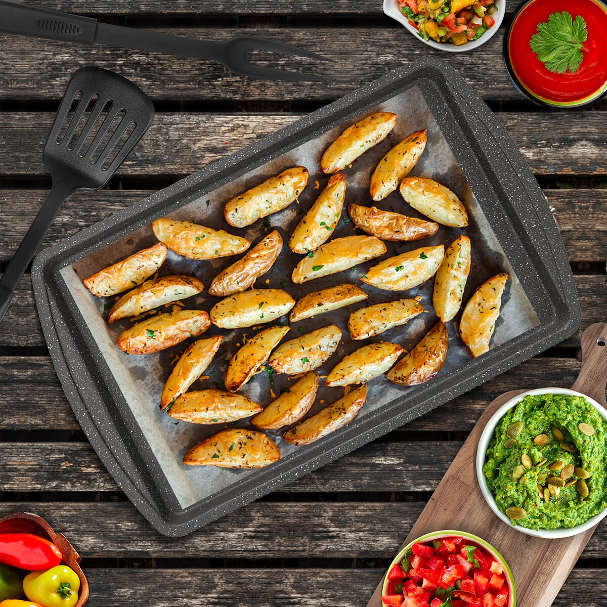 Plech nízký s kvalitním nepřilnavým povrchem, který brání připečení, a to i při použití minimálního množství tuku. Upečené dobroty snadno z plechu sundáte. Doporučujeme formu vymazat nebo vystříkat sprejem na pečení. Použijte kuchyňskou chňapku. Vhodný do plynové, elektrické i horkovzdušné trouby. Lze mýt v myčce na nádobí. Rozměry: 50x30,5 cm, vnitřní rozměry 43,5x28 cm.