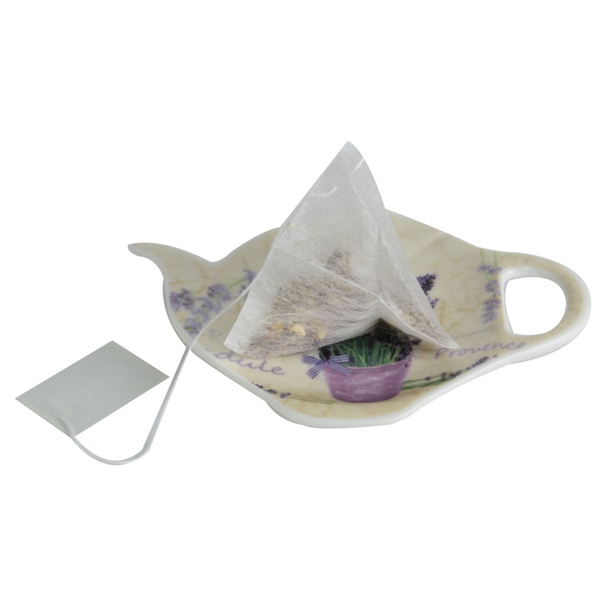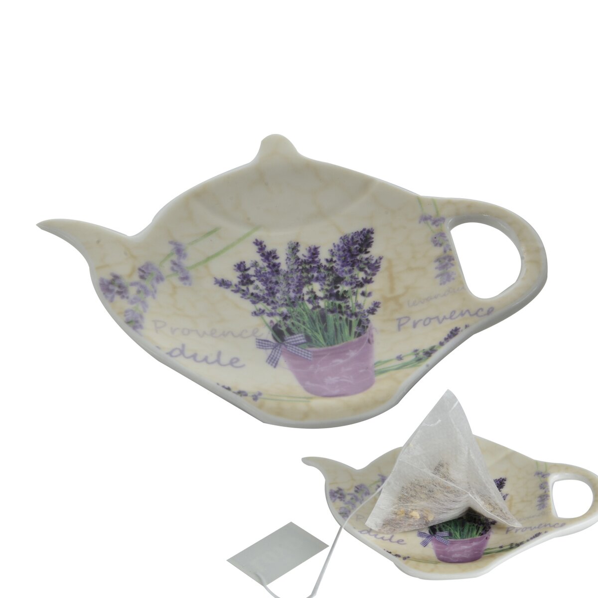 Kód produktu 125425Tácek ve tvaru konvičky - podčajník na odložení vyluhovaného čaje z hrnečku. Materiál: porcelán. Dekor LEVANDULE. Rozměry: 11,5x9x1,5 cm.