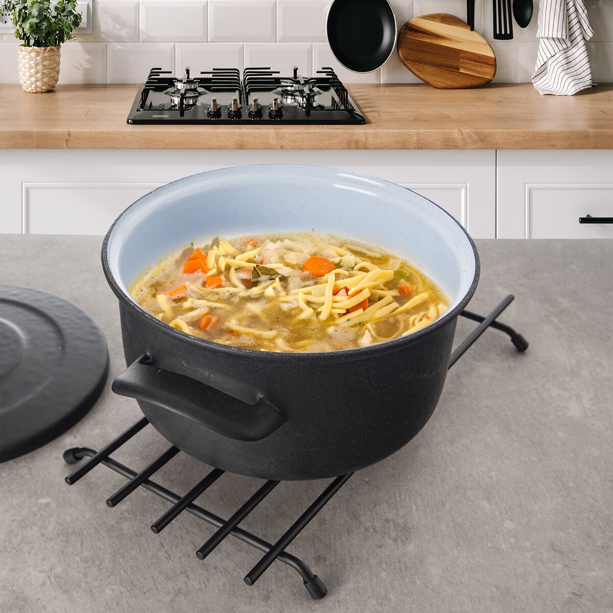 Černá kovová podložka je šikovný pomocník, můžete na ni odložit horký hrnec s polévkou, rozpálenou pánev i pekáč s voňavou pečínkou, právě vytažený z trouby.
