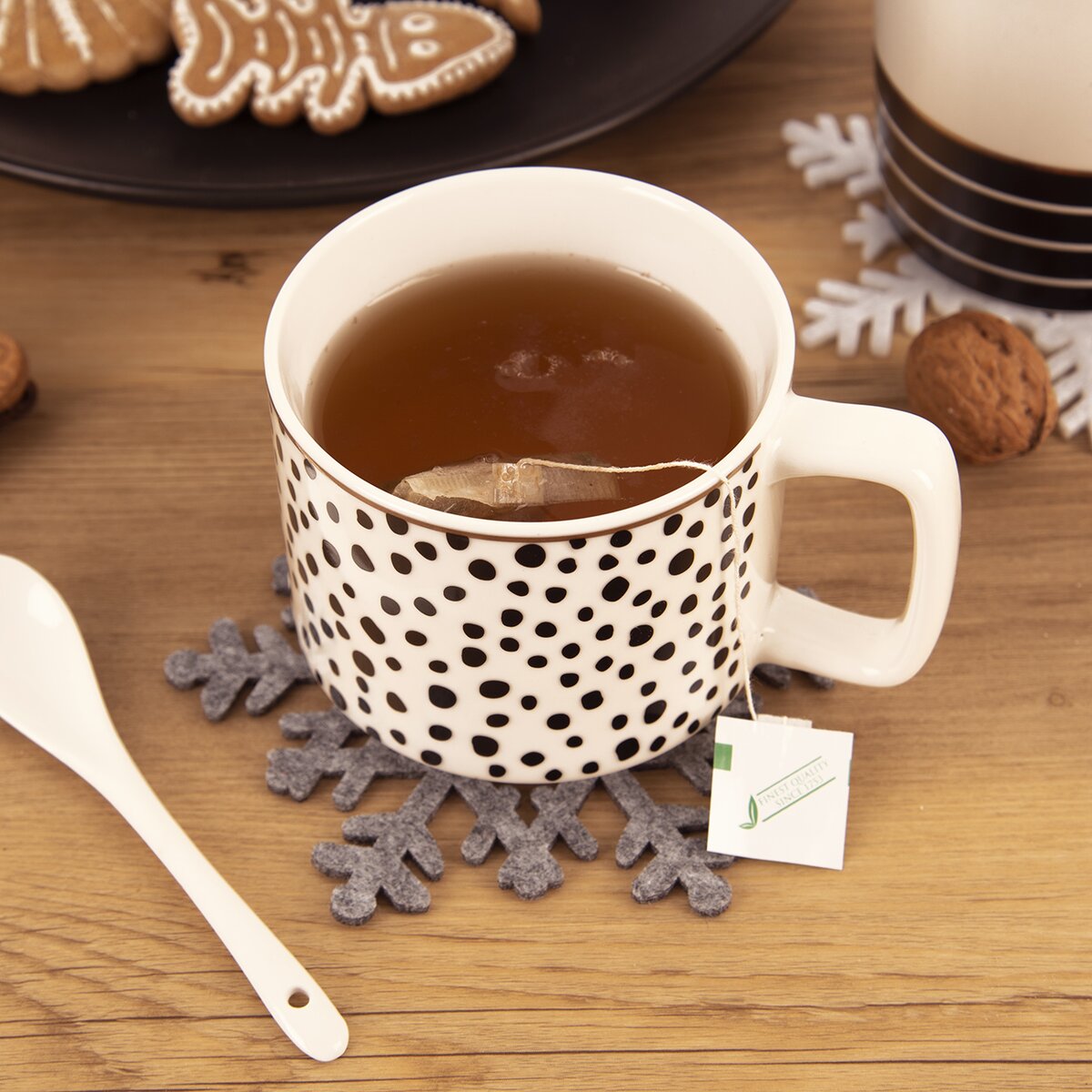 Sada 6 kusů polyesterových podtácků ve tvaru šedé vločky zamezí vzniku nevzhledných koleček na kuchyňském, jídelním stole či konferenčním stolku. Ať už si chcete vychutnat horkou kávu, vánoční svařáček nebo osvěžující limonádu v orosených sklenicích, nemusíte mít obavu z toho, že se na vašem dřevěném stole objeví nevzhledné bílé skvrny.