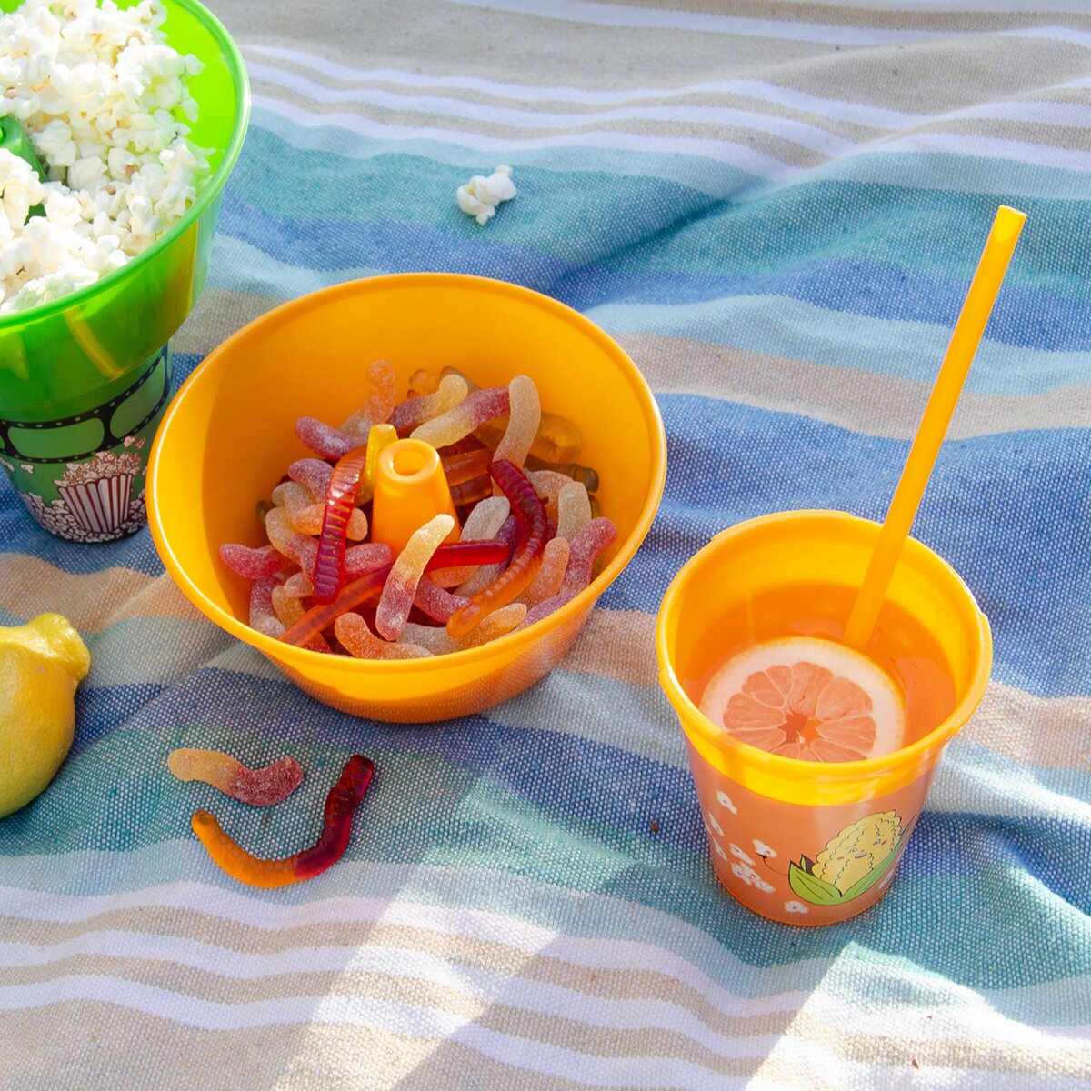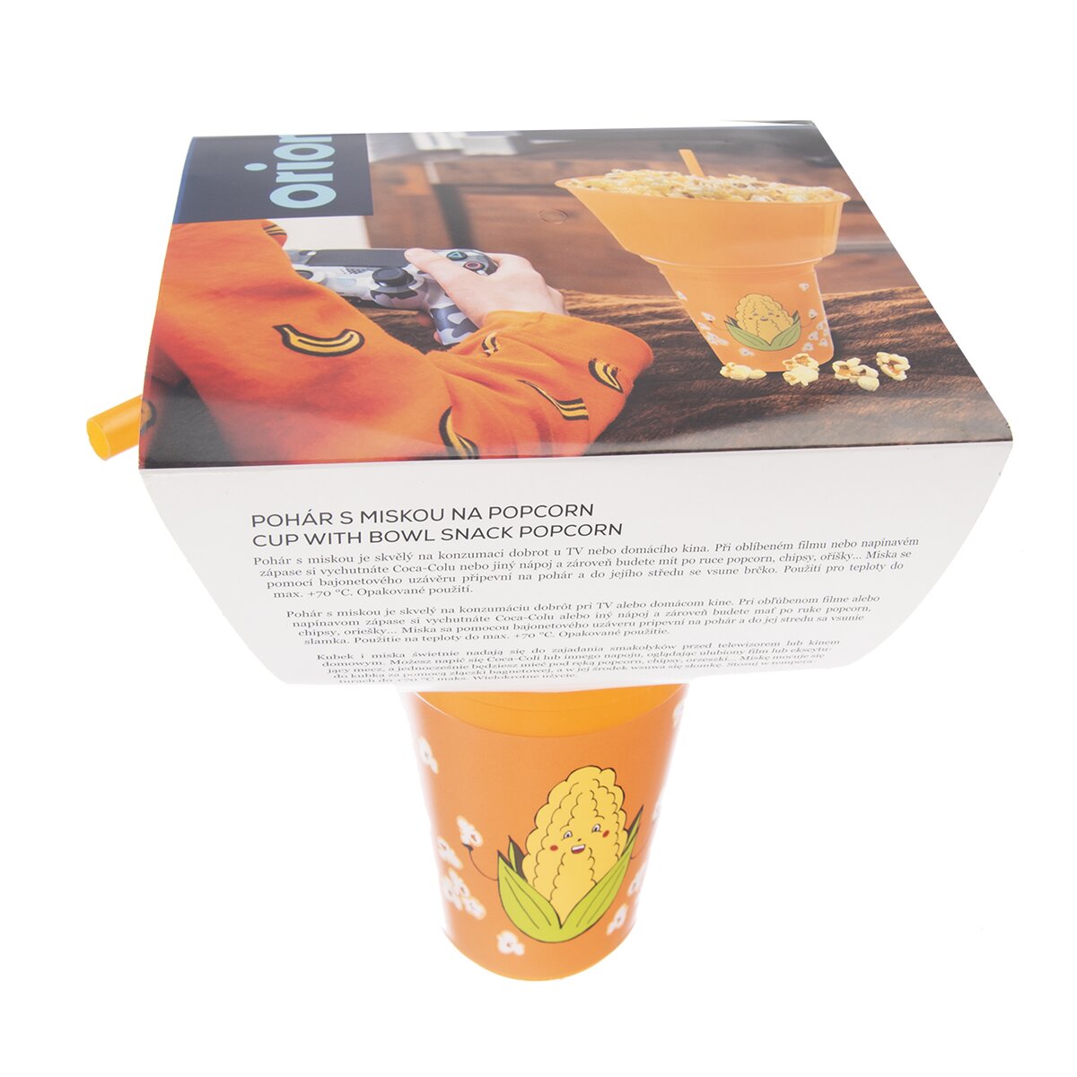 Kód produktu 121793Veselý oranžový pohár s miskou a brčkem je určen k podávání nápoje a občerstvení ve formě chipsů, popcornu, oříšků apod. Je určen ke konzumaci občerstvení u TV nebo domácího kina, na zahradní párty i pikniku.