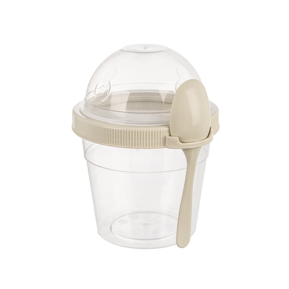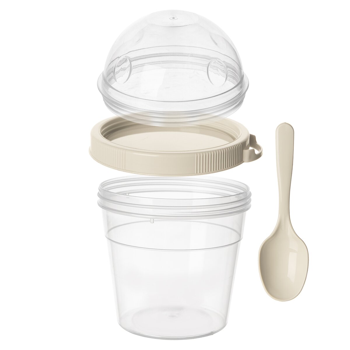 Více informacíŠikovný pohár na svačinu je dělený na spodní a horní transparentní část, které lze našroubovat na béžové víčko se závitem z obou stran. Součástí je i lžička v béžové barvě.