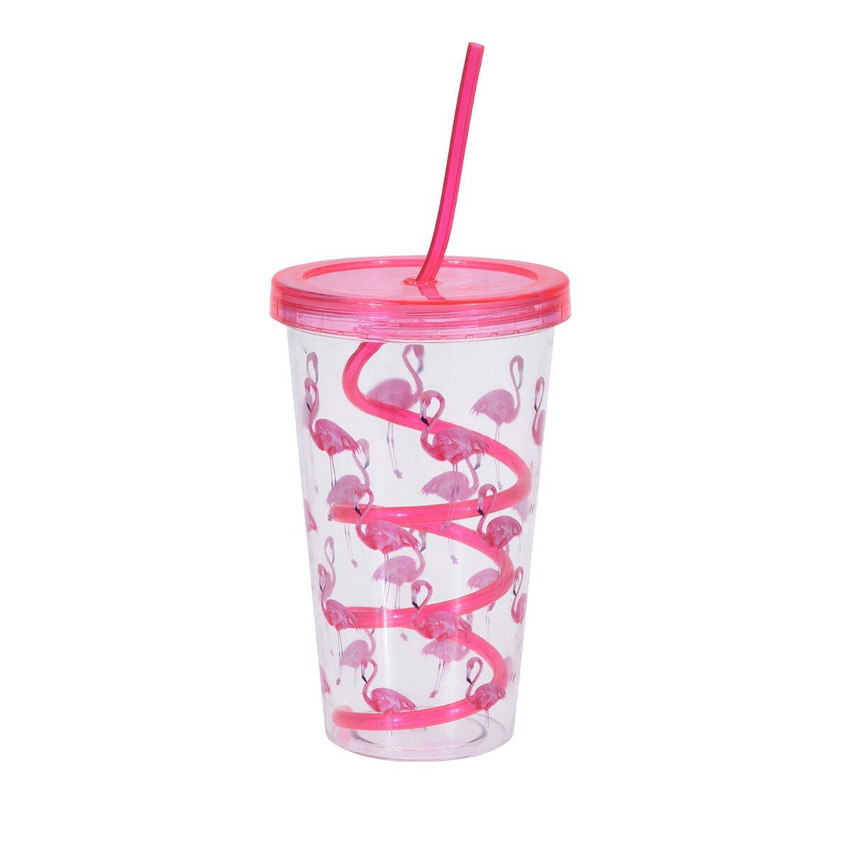 Pohár s barevným dekorem s víčkem a brčkem. Materiál: plast. Assort barev a dekorů. Rozměry: objem 0,45 l, pr. 10 cm, v. 15,5/23 cm.