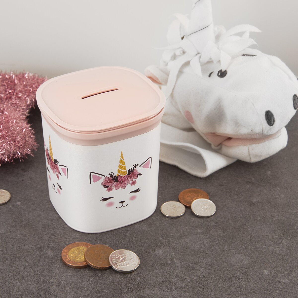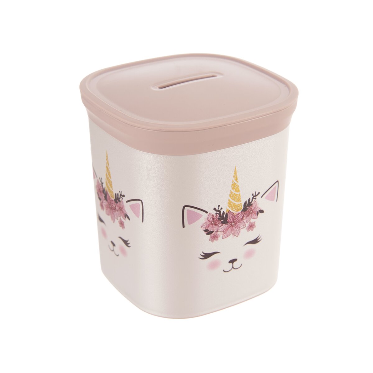 K tomu poslouží hezká pokladnička z plastu PP, kterou zdobí dekor něžných jednorožců. Má odnímatelné víčko, takže si je malý nebo velký spořílek může čas od času spočítat, jestli už tam je požadovaný obnos.