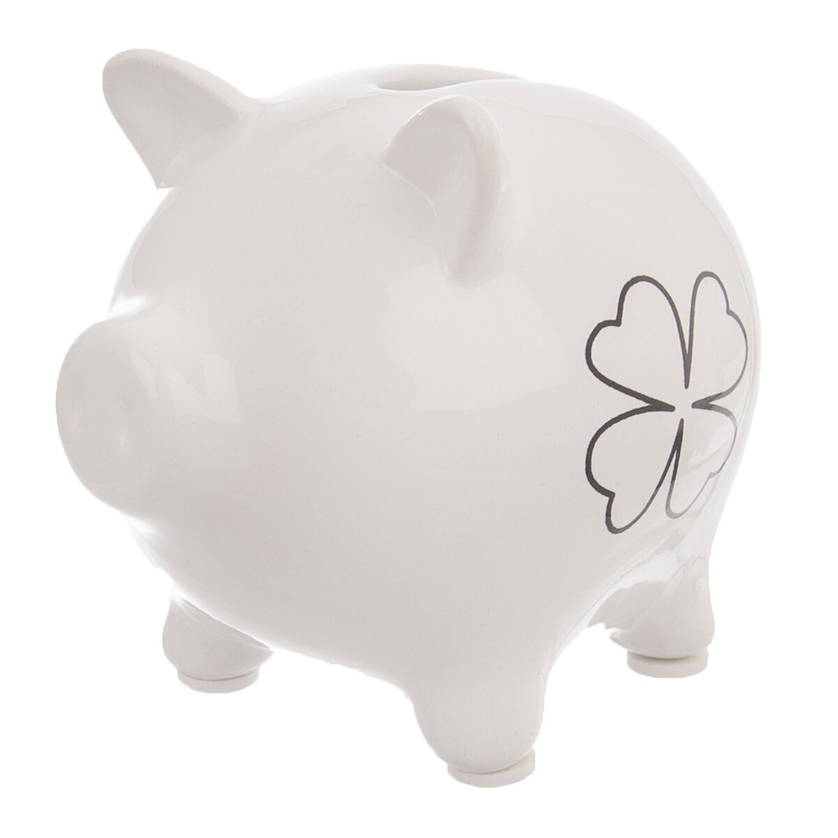 Jestliže si chcete našetřit na vánoční dárky, víkendový wellness pobyt nebo nový mobil, zkuste házet nastřádané mince do této keramické pokladničky. Má tvar roztomilého bílého prasátka, které má na boku čtyřlístek pro štěstí.