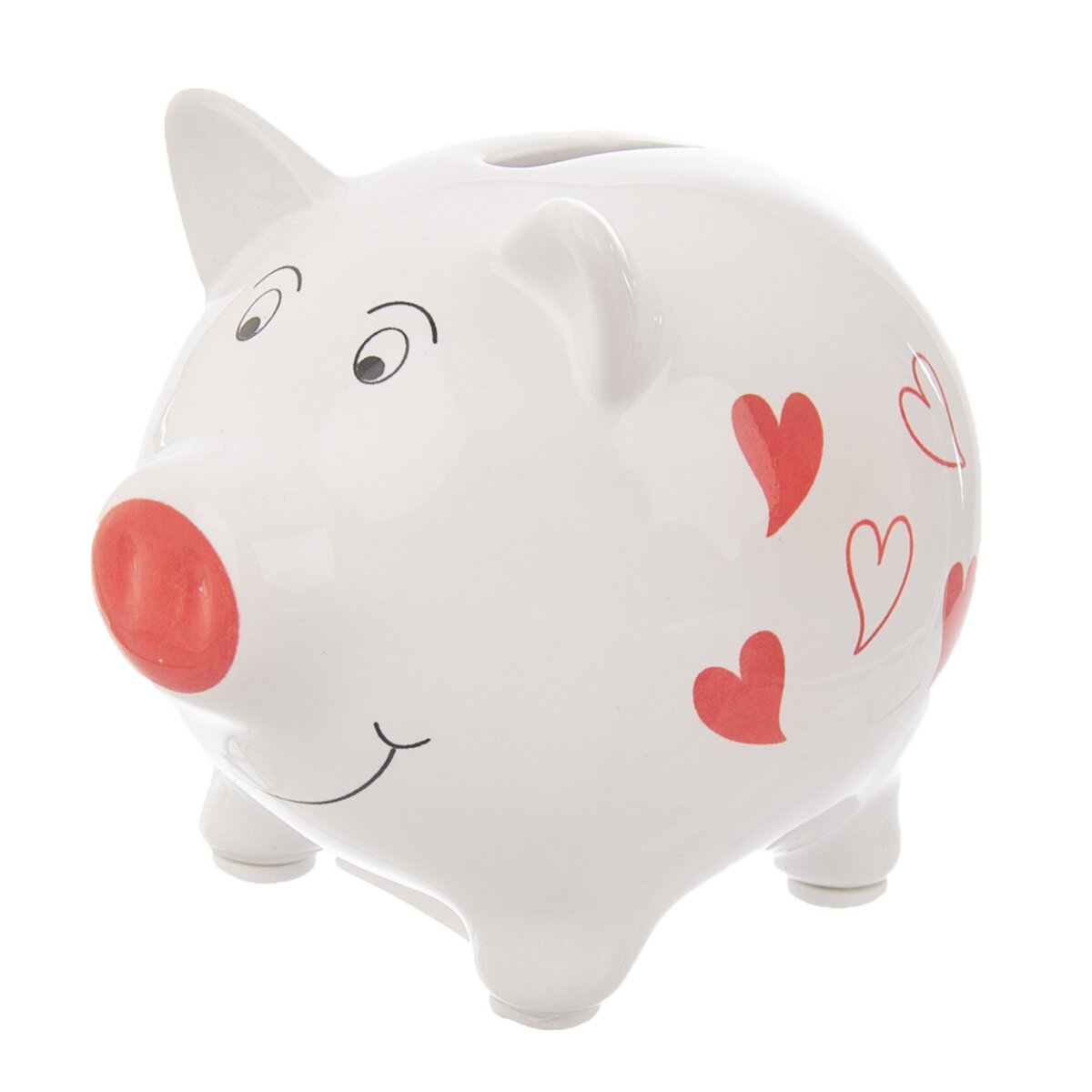 Jestliže si chcete našetřit na vánoční dárky, víkendový wellness pobyt nebo nový mobil, zkuste házet nastřádané mince do této klasické keramické pokladničky. Má tvar roztomilého bílého prasátka, které má na boku červená srdíčka. Nebo jej naplňte mincemi a darujte ho novomanželům nebo jubilantovi.