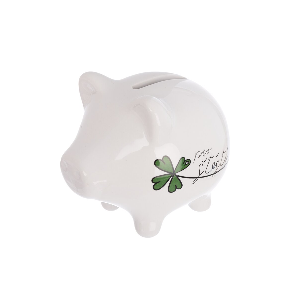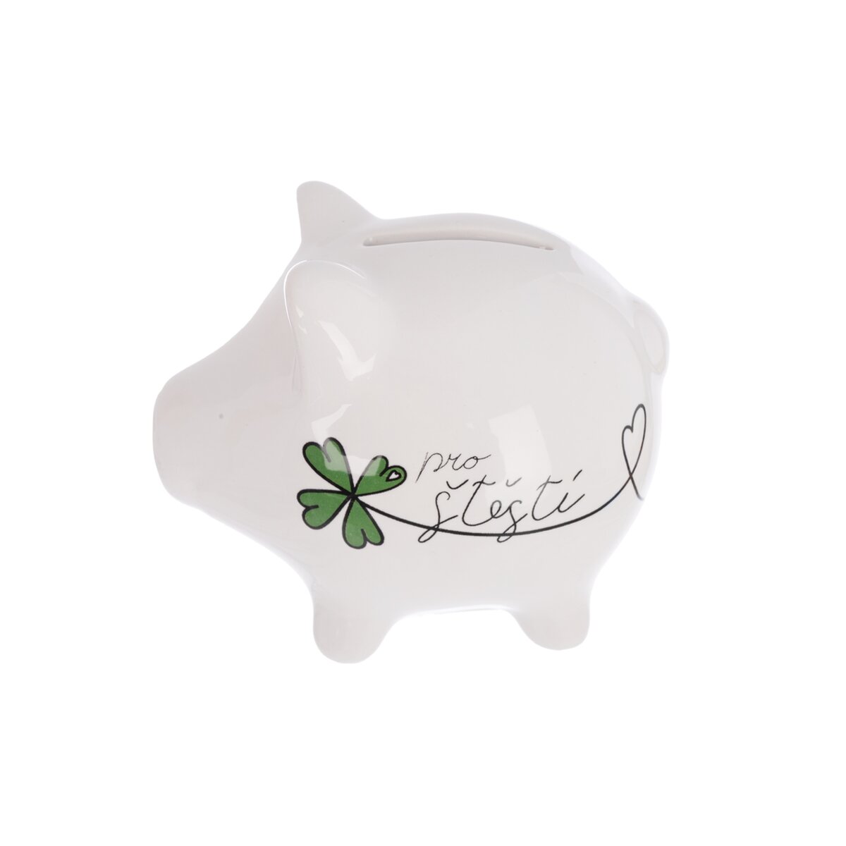 Více informacíBílá keramická pokladnička ve tvaru menšího prasátka s nápisem „Pro štěstí“ je praktickým a stylovým doplňkem, který slouží jako talisman a motivace k šetření na sny, jež stojí za to. I když štěstí si koupit nelze, můžete si na něj postupně našetřit a každý vložený příspěvek se stane krokem k naplnění přání.
