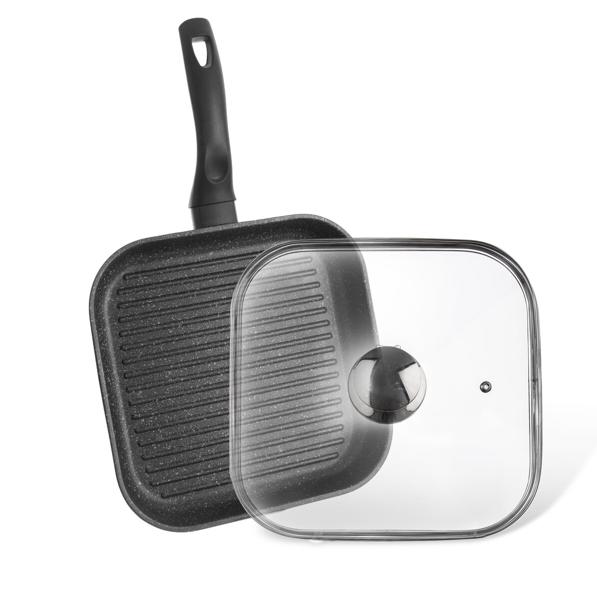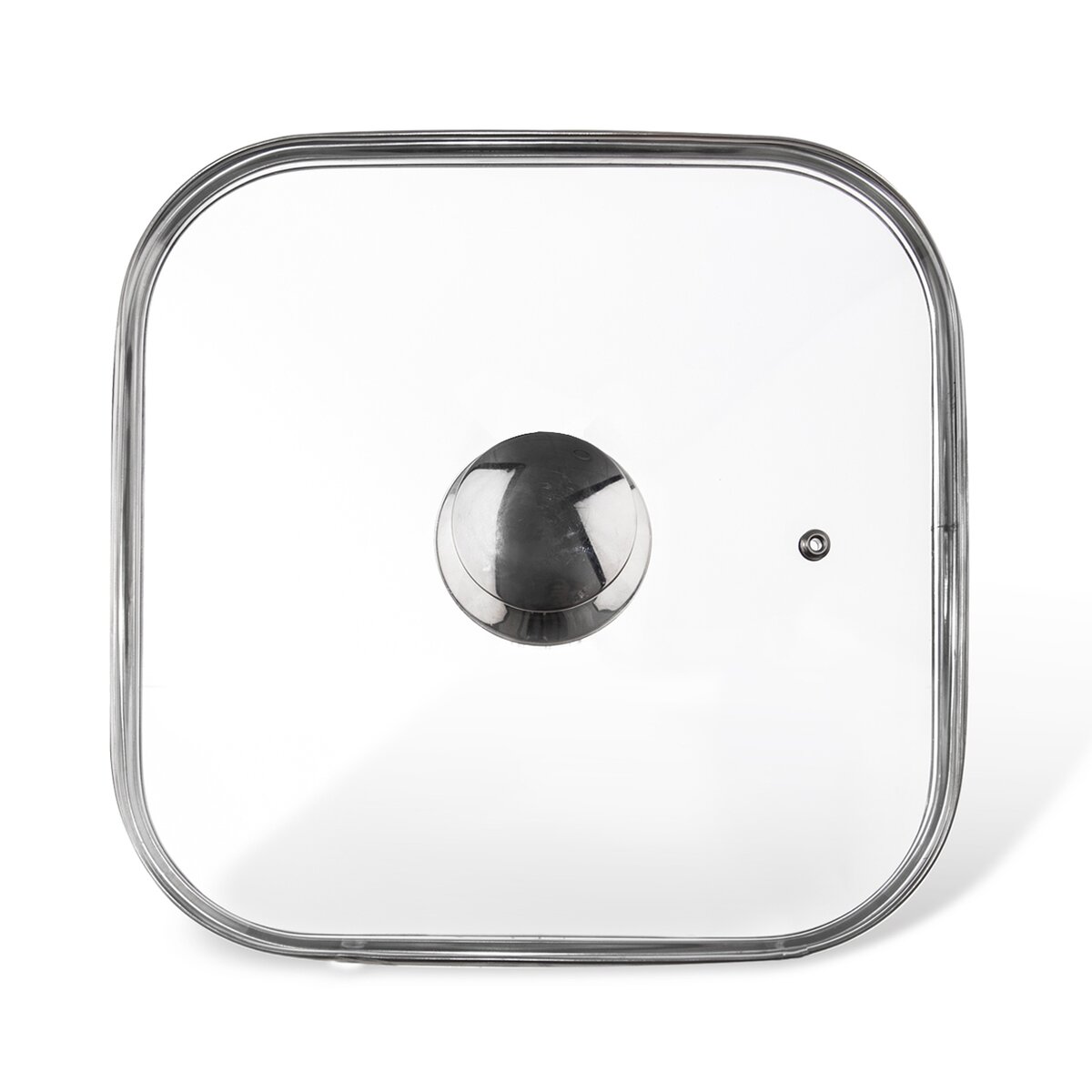 Praktická hranatá poklice s nerezovým úchytem a otvorem pro únik přebytečné páry umožní vizuální kontrolu nad stavem připravovaného pokrmu.