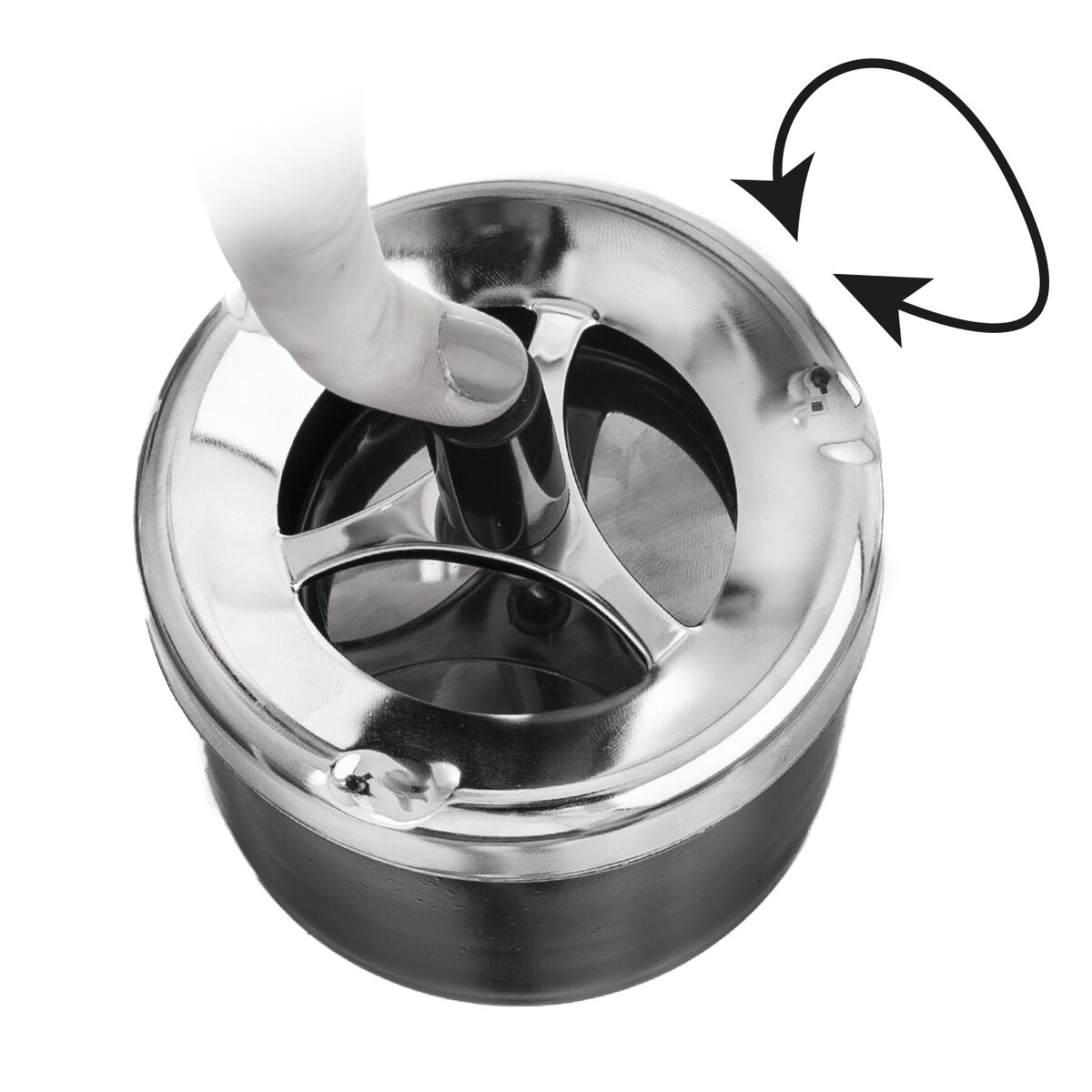 Tento kovový popelník má víko s otočným mechanismem na principu pístu. Po stlačení páčky vsypete popel do zásobníku. Poté co ji pustíte, se popelník sám uzavře, díky čemuž se zabrání dalšímu poletování a sypání popela.