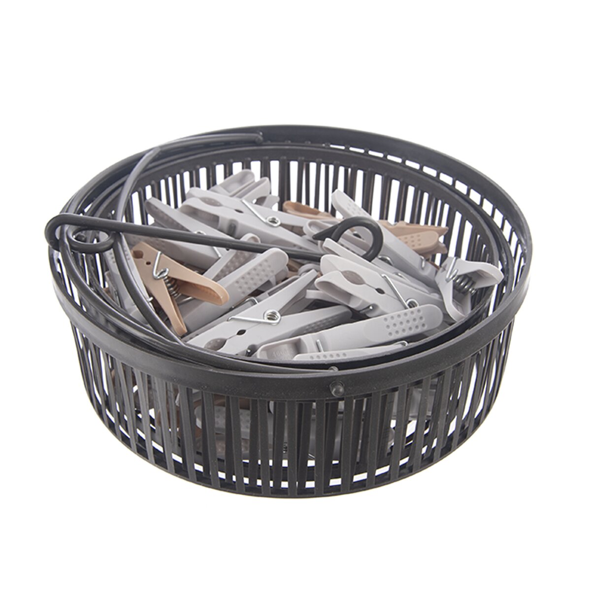 Kód produktu 531157Sada 50 kusů plastových kolíčků na prádlo, uložených v rozkládacím košíku s očkem. Ten lze jednoduše zavěsit za prádelní šňůru či konstrukci sušáku a podle potřeby složit a uklidit.