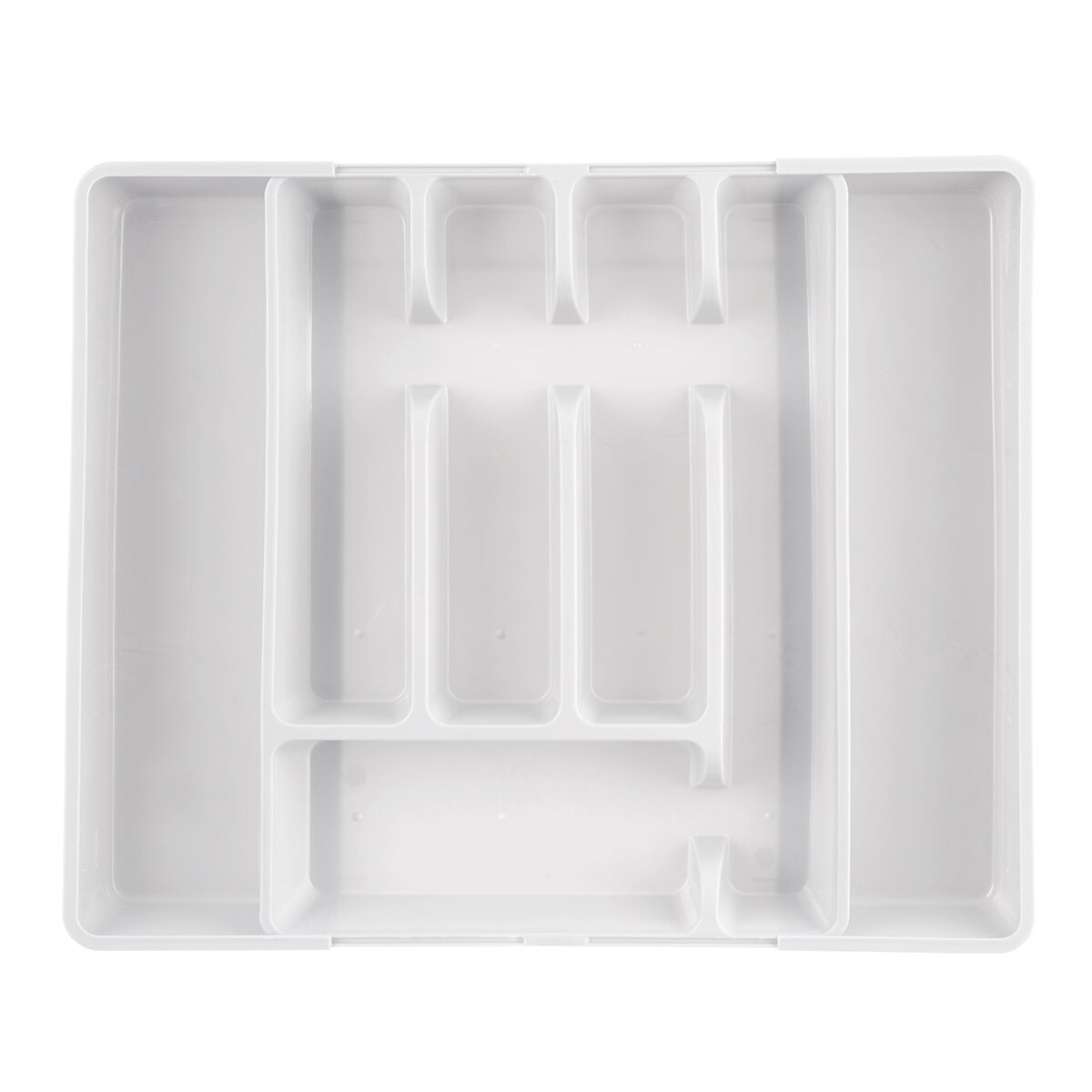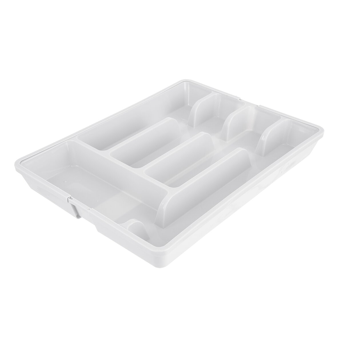 Kód produktu 150748Bílý plastový příborník má velikost 27,5/44x36,5x4,3 cm. Je rozdělený na 5 základních sekcí, navíc se dvěma dalšími sekcemi, které lze vysunout do stran.