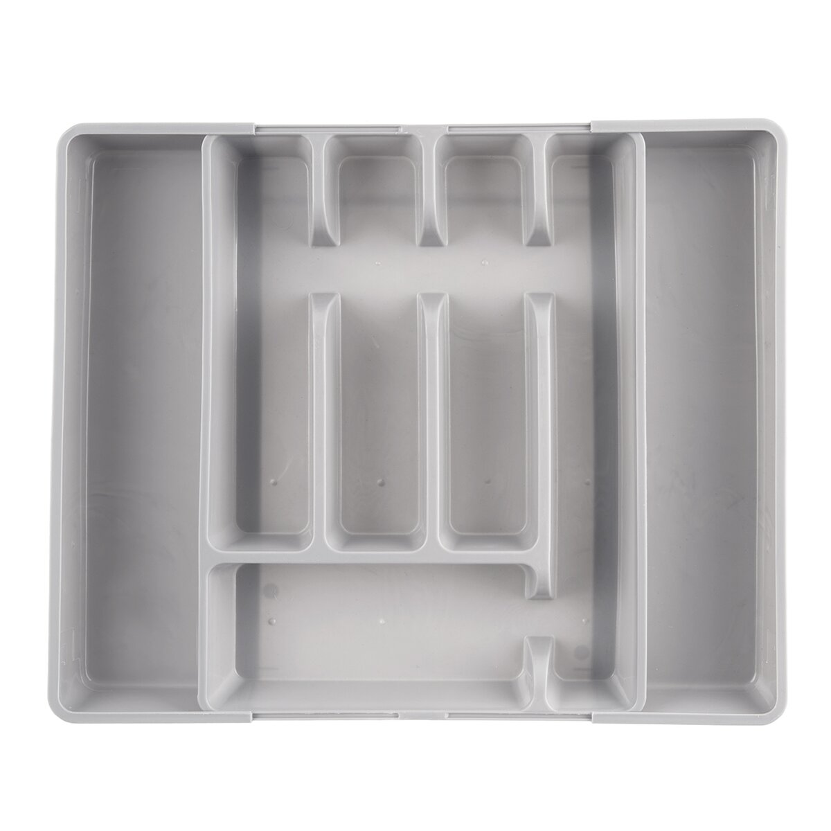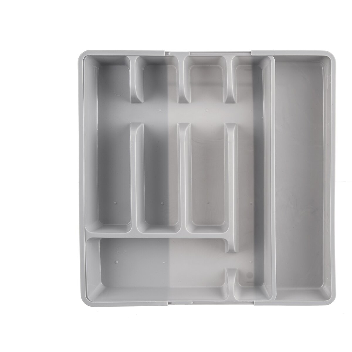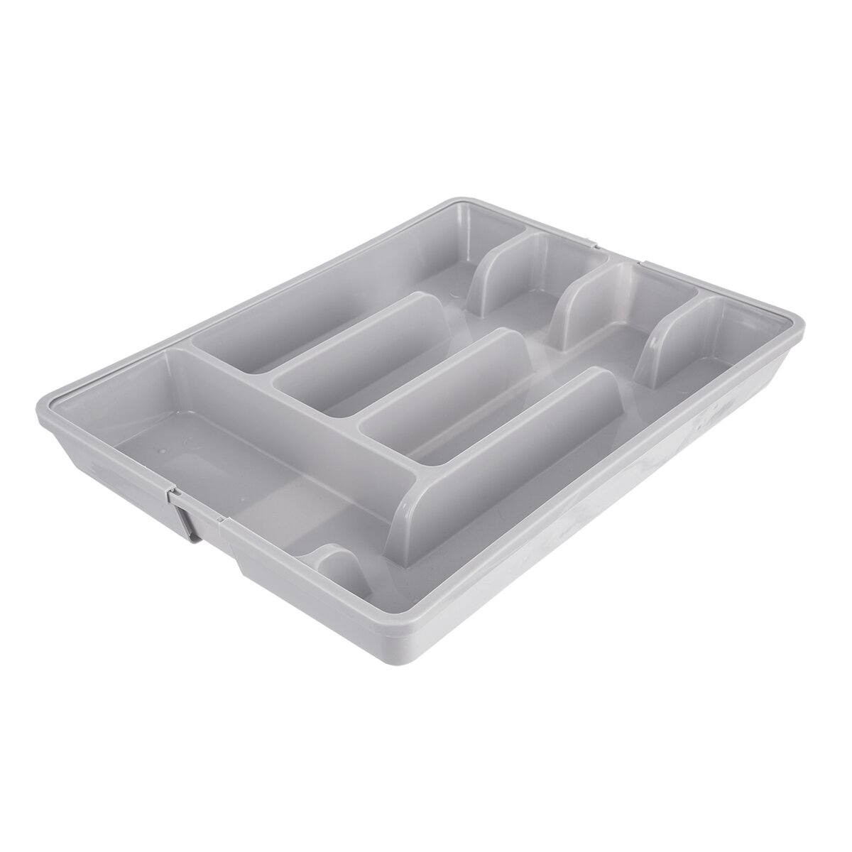 Kód produktu 150749Šedý plastový příborník má velikost 27,5/44x36,5x4,3 cm. Je rozdělený na 5 základních sekcí, navíc se dvěma dalšími sekcemi, které lze vysunout do stran.