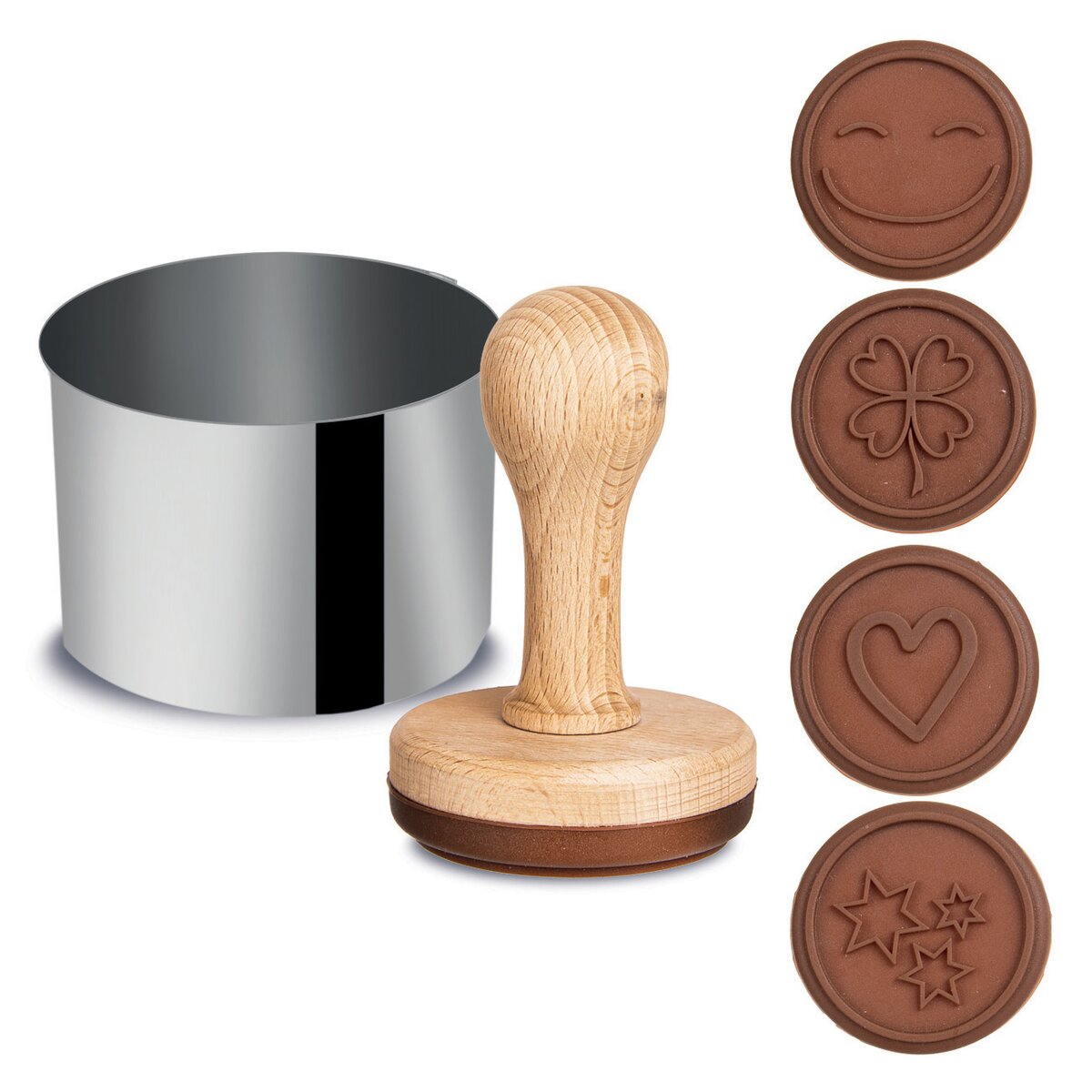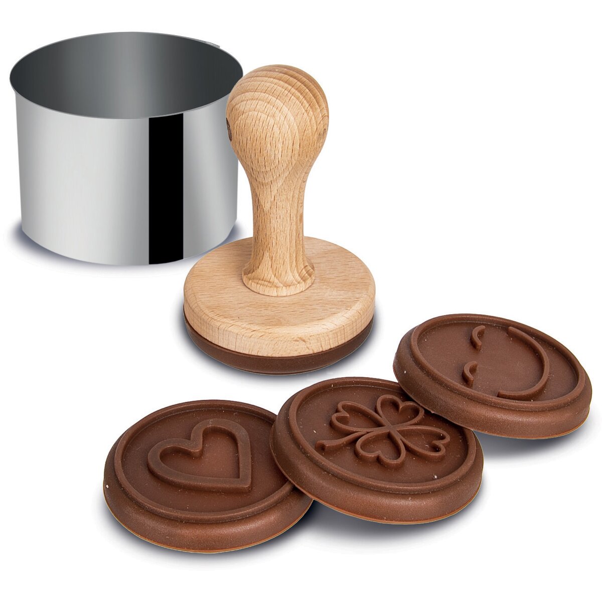 Kód produktu 124992Sada na pečení originálních sušenek, perníčků, tzv. embosovaného cukroví, obsahující dřevěné razítko, 4 různé univerzální motivy na silikonových nástavcích a nerezový kroužek k vykrajování z těsta.