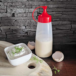Budeme potřebovat nepřilnavou pánev, obracečku a hlavně plastovou láhev, kterou běžně používáme na kečup nebo různé dresingy.