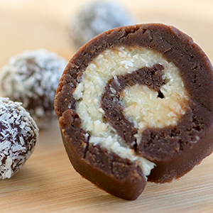 Jednoduché, efektní a vždy slavnostní. Stačí kokos, slazené kondenzované mléko a kakao. Vytvořte dvoubarevné válečky nebo roládu, kterou po vychlazení nakrájíte na suky.