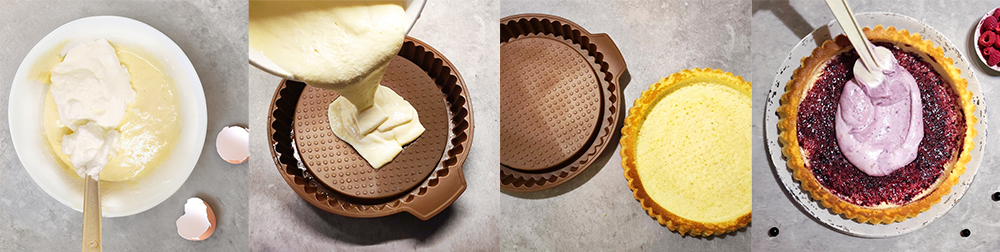 Poté přidáme lžíci oleje a vody, vanilkový cukr a nakonec mouku smíchanou s kypřicím práškem. Do těsta pak ručně stěrkou jemně zamícháme sníh, spíše převracíme než šleháme. Vlijeme do olejem vystříkané silikonové formy 1 cm po okraj, lem vytvoří po vyklopení pěkný zvednutý okraj. Těsto ještě lehce urovnáme stěrkou od středu k okrajům, to zajistí, že se korpus nevyboulí. Pečeme v rozehřáté troubě při 180 °C 20 minut.