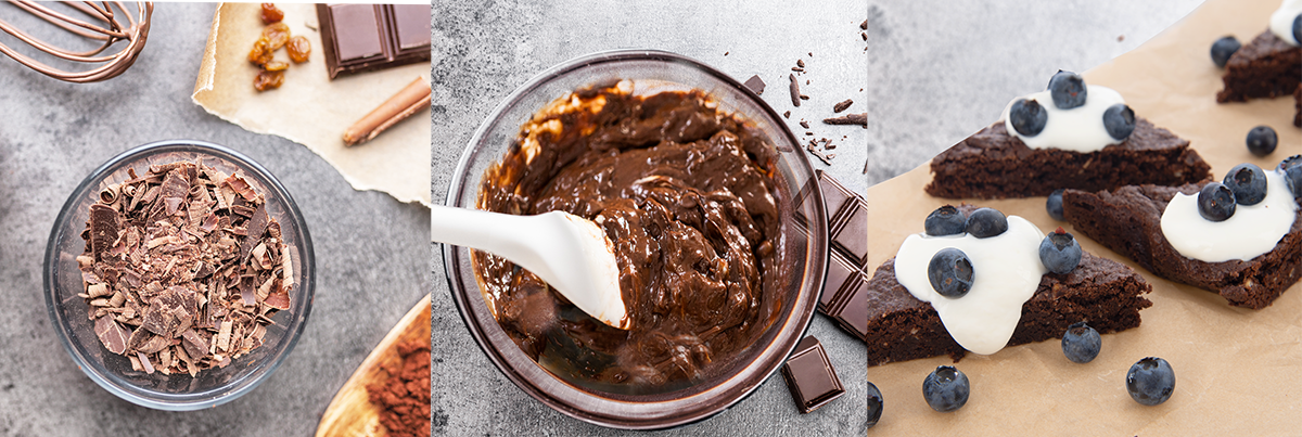 Těsto nalijte do vymazané zapékací mísy, na toto množství se hodí menší plech nebo zapékací mísa cca 30x20 cm a vložte do předehřáté trouby. Lze také použít pečicí papír a formu jím vyložit. Pečte při 180 °C 20 minut. Po píchnutí špejlí by mělo být těsto ještě trochu lepkavé, to je ten správný okamžik k vyndání vláčného brownies z trouby. Nechte jej vychladnout a poté krájejte na dílky a podávejte se zakysanou smetanou, tvarohem a ovocem. Sladit jej nemusíte, díky cukru a čokoládě v těstě je tento luxusní a rychlý dezert sladký dostatečně.