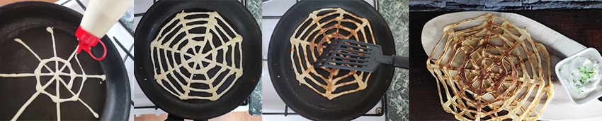 Na pánev nakapejte trochu oleje, sundejte uzávěr láhve, lehce ji stiskněte a kreslete pavučinu. Od základního kříže až po spirálově zatočený výplet.