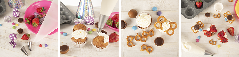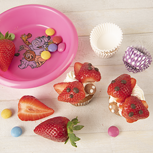 Oživte klasické muffiny jahodovými beruškami a karamelovými motýlky. Samotné muffinky můžeme připravit 1-2 dny před oslavou a zdobit je až těsně před ní. Navíc je tento recept hrníčkový, takže není třeba odvažovat suroviny a spolu s dětmi si je může každý doladit k dokonalosti.