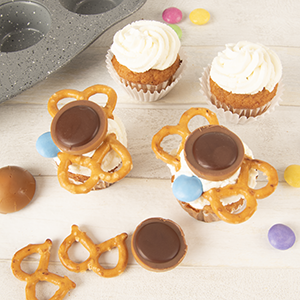Muffinky pečeme ve vyhřáté troubě podle jejich velikosti 15-20 minut při 150 °C, stupeň propečení lze zjistit zapíchnutím špejle, na kterou by se těsto nemělo lepit. Toto množství vyjde na 40-50 muffinů ve formě o průměru prohlubní 3,5-4 cm, ale věřte že i tak jich nebude dost. Navíc některé malí pomocníci snědí hned po vytažení z trouby nebo při jejich zdobení.