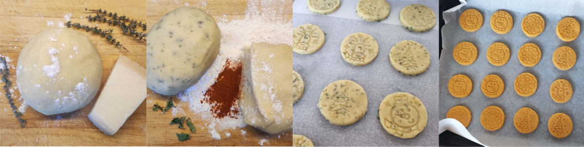 Na lehce pomoučeném vále vyválejte plát o tloušťce 0,5 cm a s pomocí razítek a kovové vykrajovačky tvořte sušenky. Toto množství vyjde na cca 2 plechy kulatých sušenek.