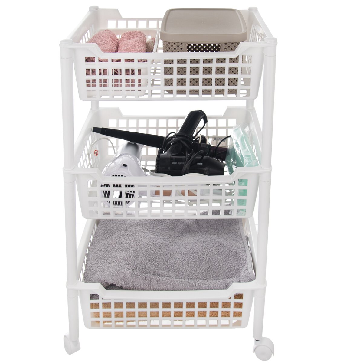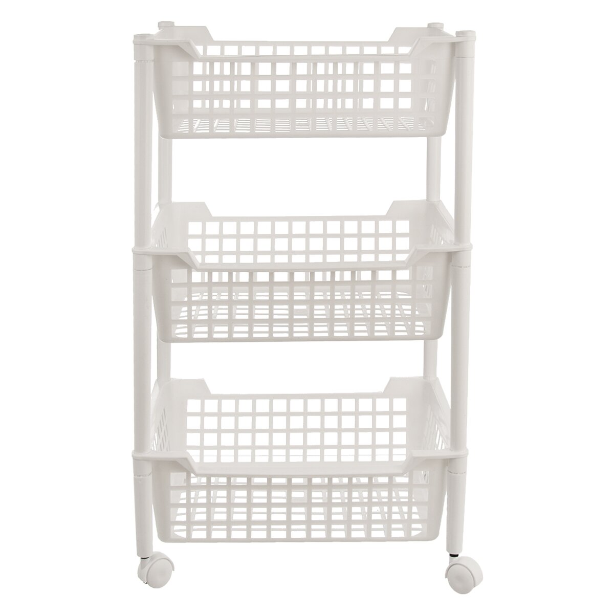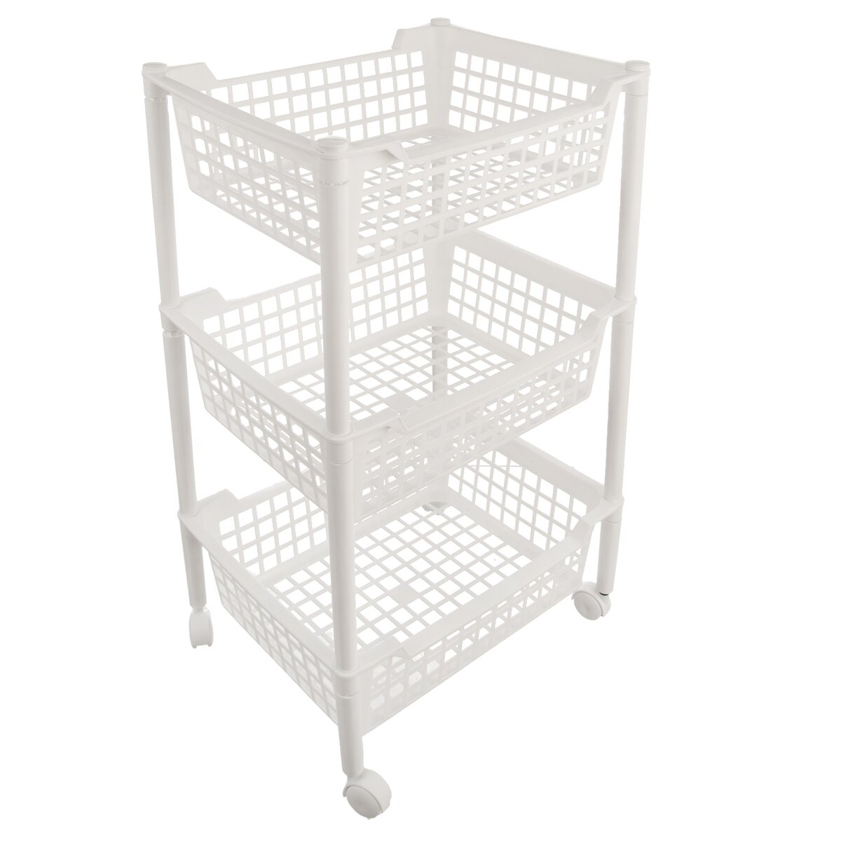 Kód produktu 812606Plastový bílý regál se 3 perforovanými zásuvkami a kolečky, ideální pro uložení věcí v kuchyni, koupelně, šatně i v provozovně.