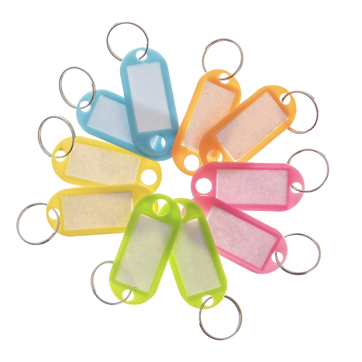 Sada 10 ks žlutých, oranžových, růžových, zelených a modrých rozlišovacích visaček nabízí možnost popisku.